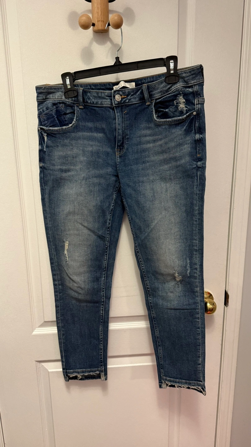 Women's distressed denim jeans. Light wash. Slight distressing throughout. Ankle length.