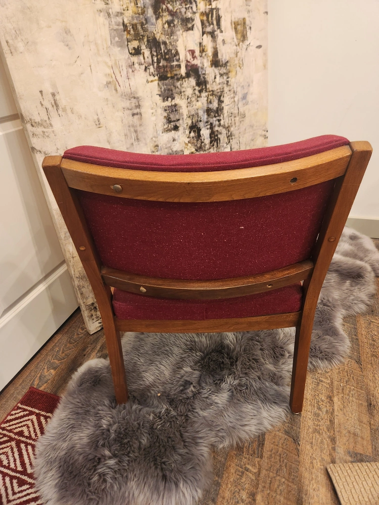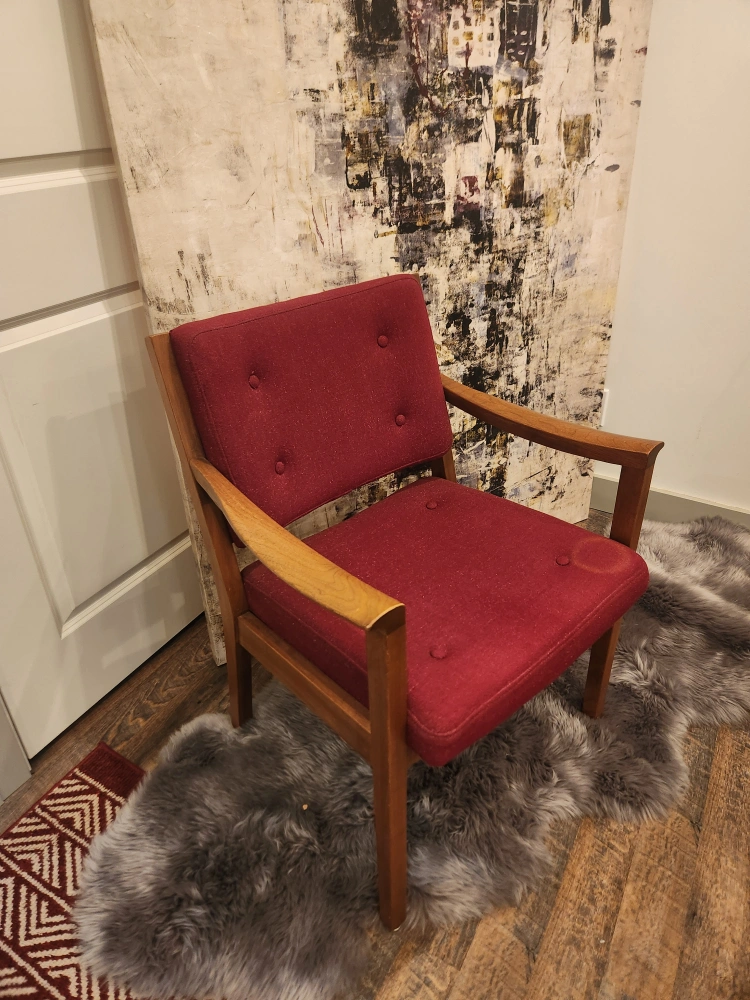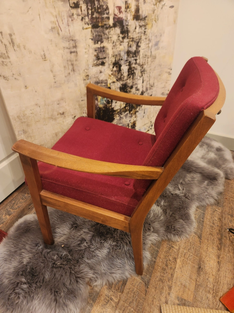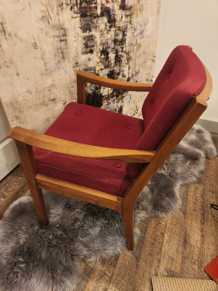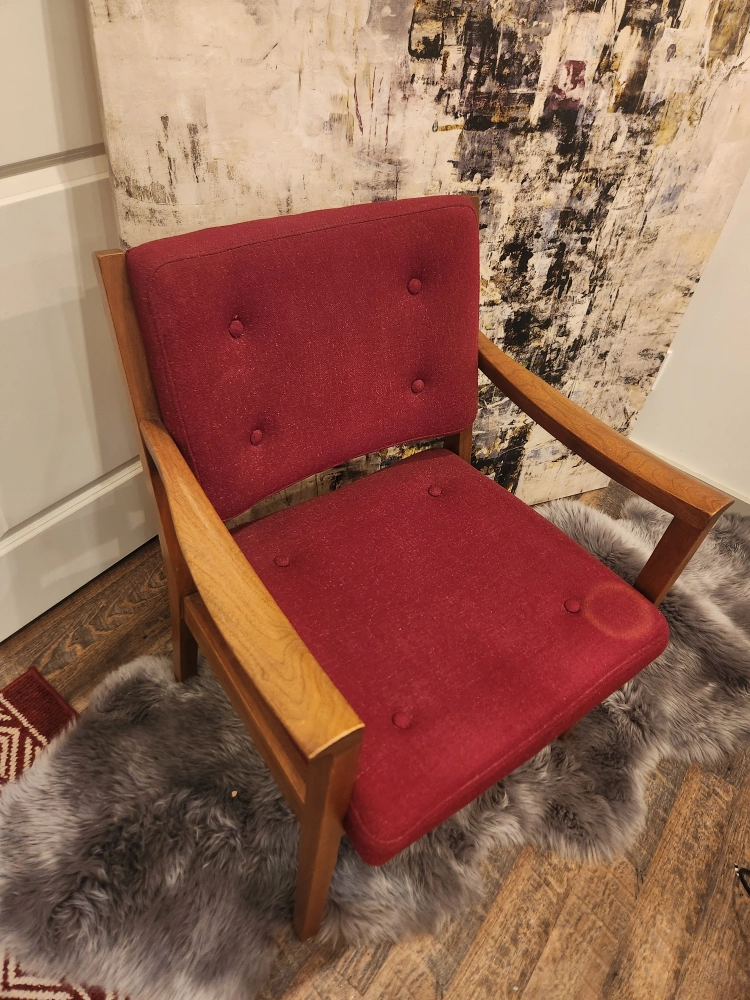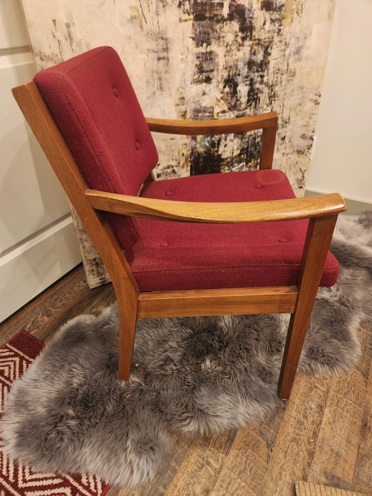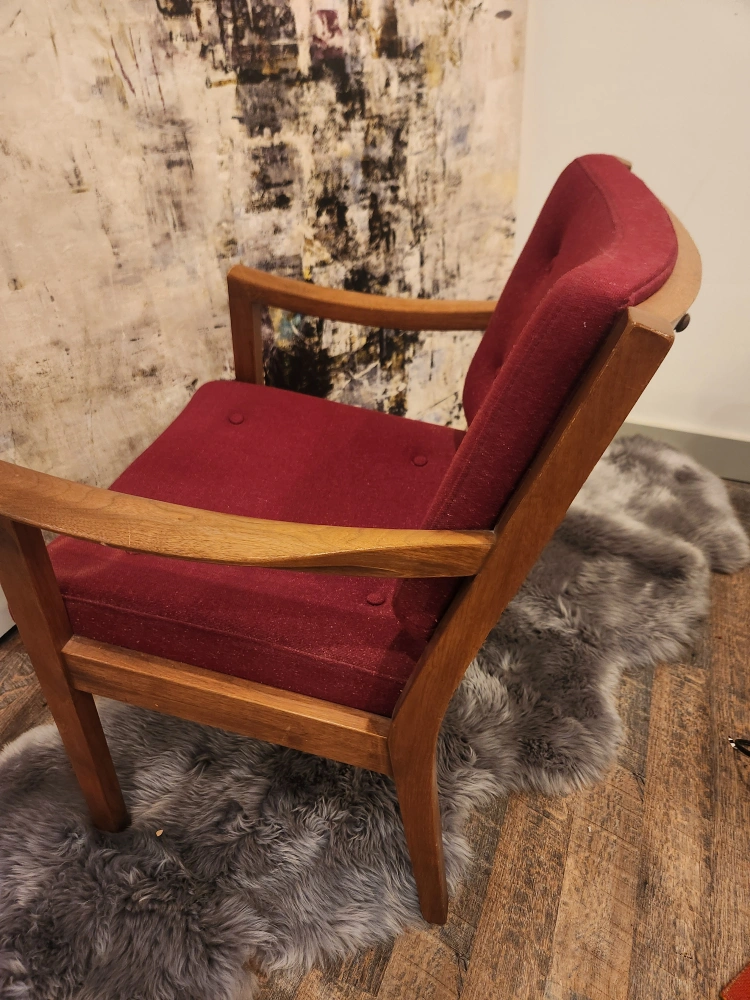 RARE 1950's Teak armchair by Ole Wanscher for France & Son. SHOP & compare price.Teak frame. Burgundy fabric upholstery. Button tufting. Mid-century modern style. This GORGEOUS mid Century Modern teak chair is everything! 1950's minimalist armchair by designer Ole Wanscher was created for the France and Son furniture company. Simple minimalist design, clean lines and mid century modern style is a fantastic addition to any space. Seat surface is 19x21 inches, seat is 18 inches high, top of chair back 32 inches, arm is 25 inches high, space between arms is 21 inches, outside of arms are a 26 inch distance.
