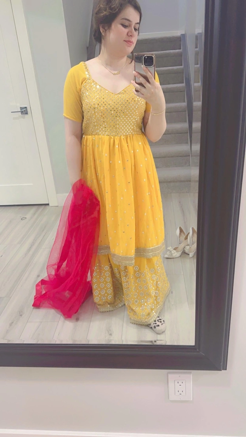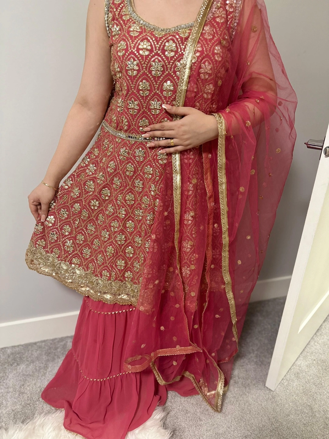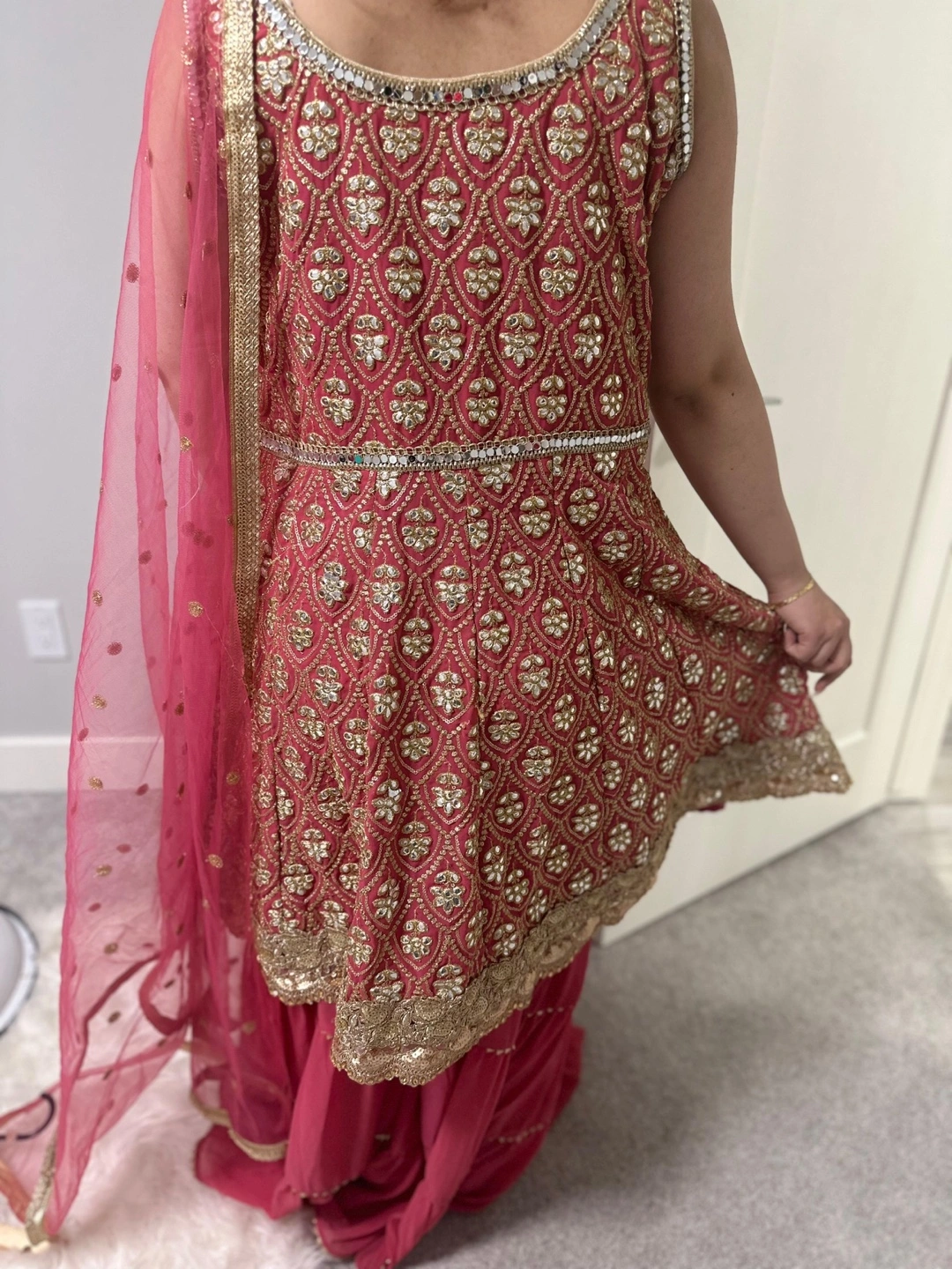 Beautiful sleeveless sharara suit. Pink fabric with gold embroidery and embellishments. Includes a matching dupatta. Perfect for special occasions.
