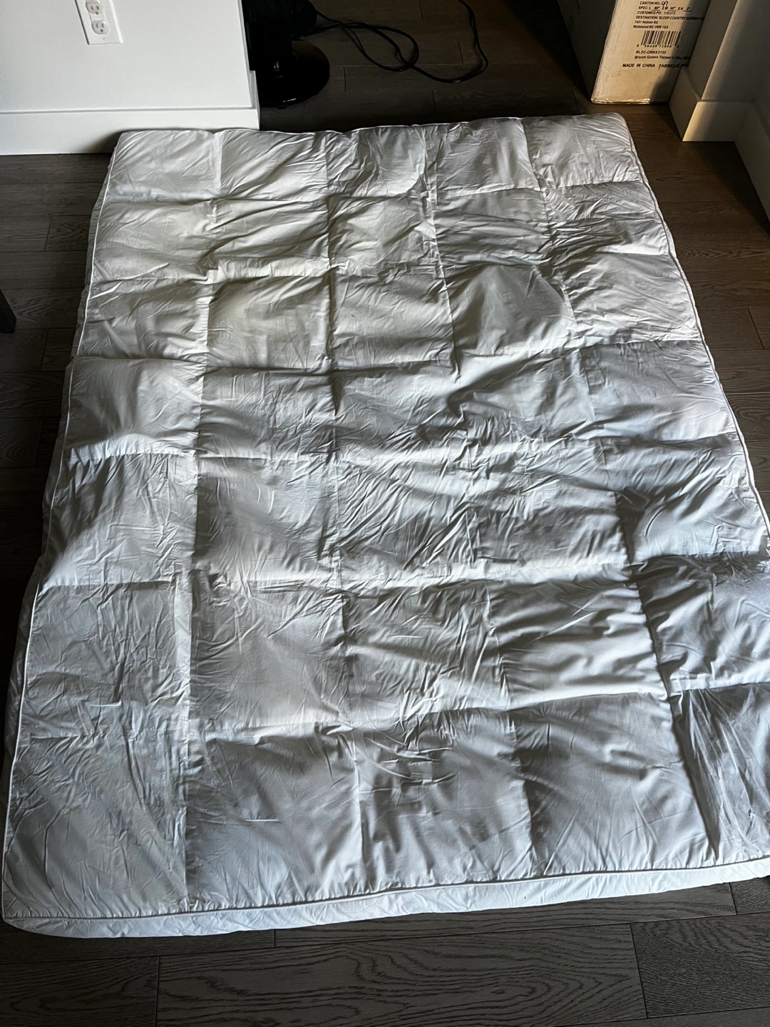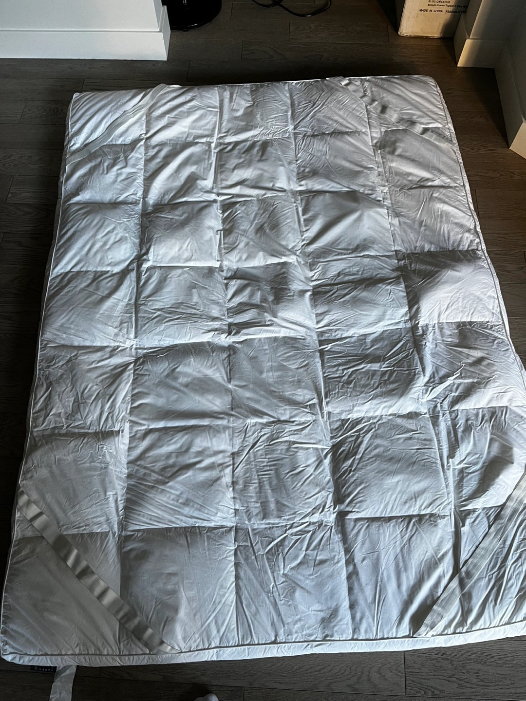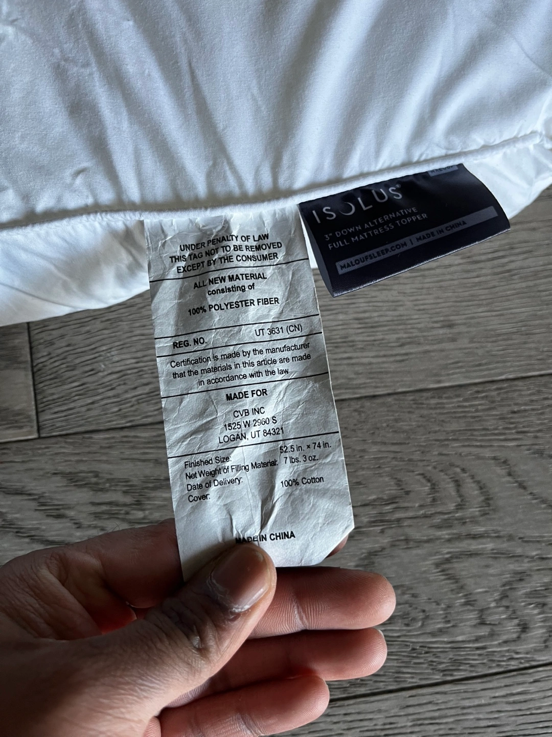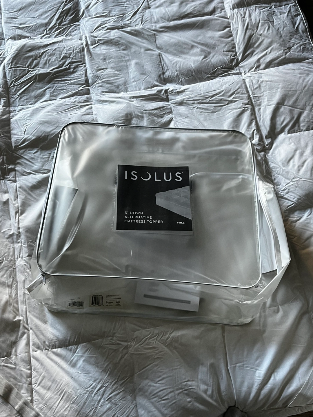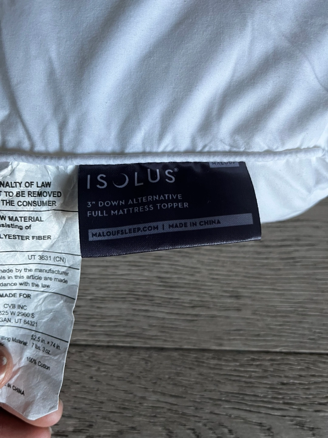 443” thick down alternative mattress topper adds additional cushioning to your existing mattress. Has corner elastic anchor bands to secure to mattress. Haven’t used it in a couple years and found it in storage. Been recently washed and open to delivery! For more information, check out: https://www.thehomeoffoam.com/product/malouf-isolus-3-inch-down-alternative-mattress-topper/