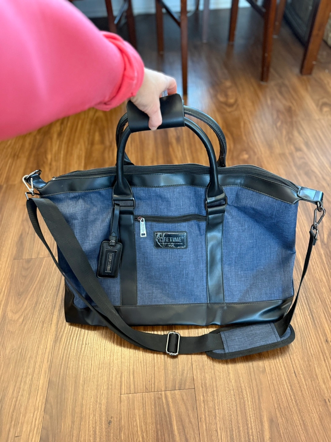 Blue and black duffle bag. Features a top handle and a detachable/adjustable shoulder strap. Multiple interior pockets, zipper closure.