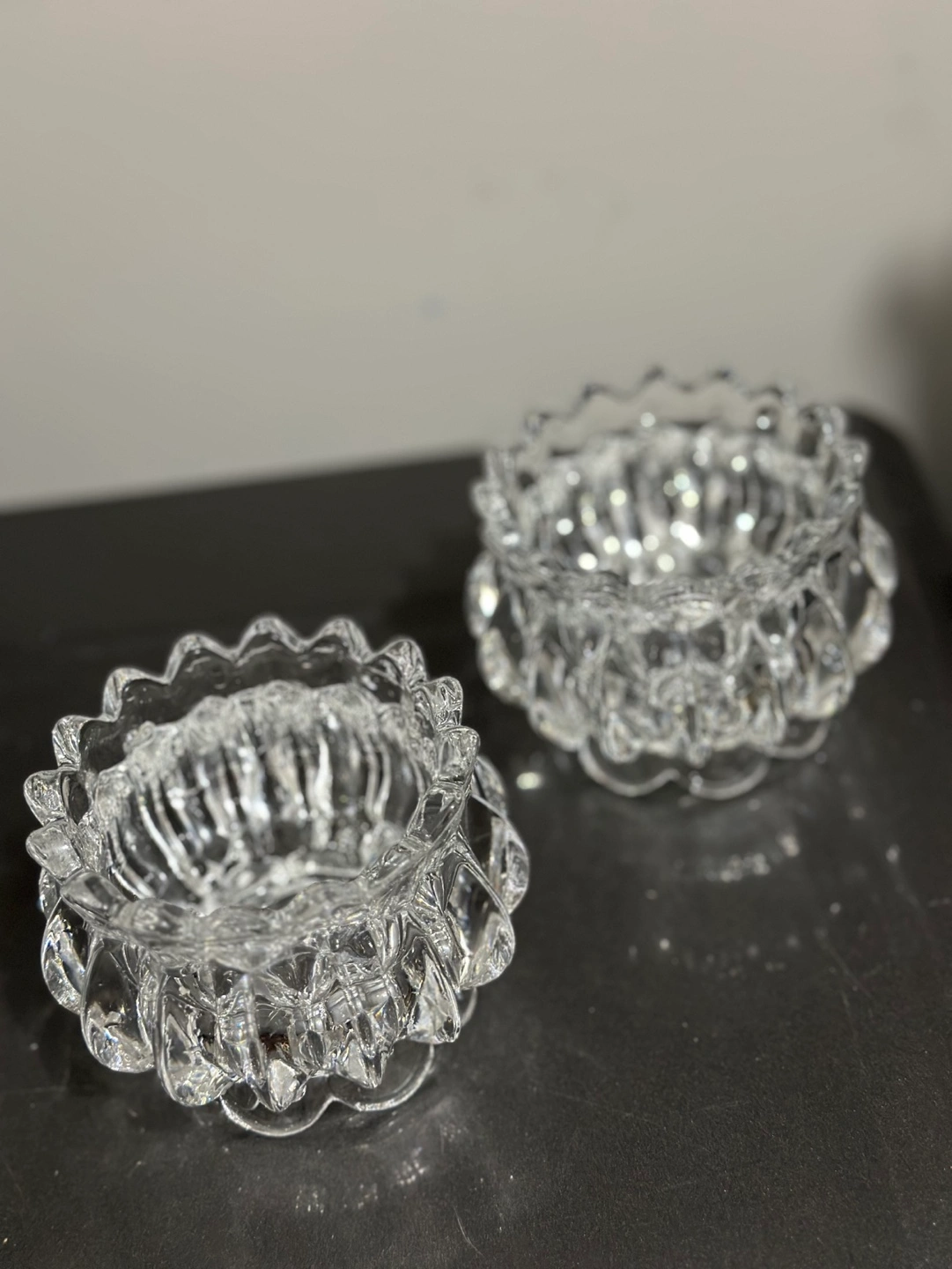 Two lovely crystal candle holders. Small, decorative, and elegant. Perfect for adding a touch of sparkle to any room.