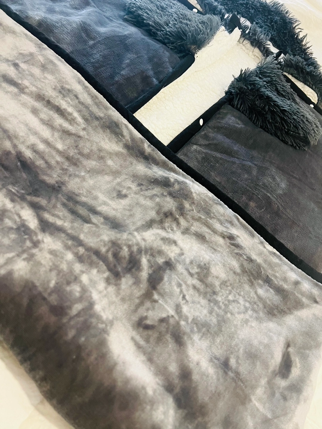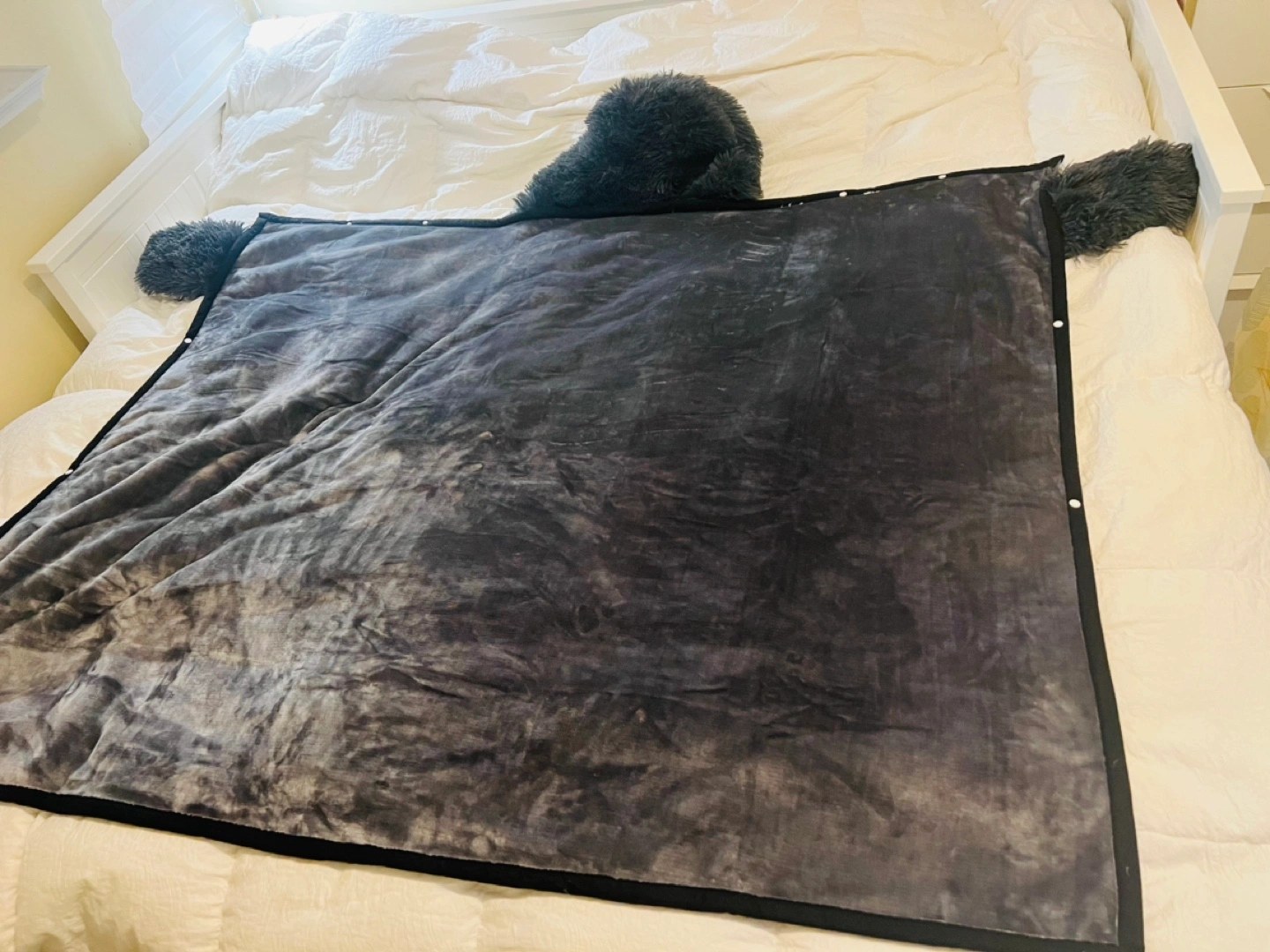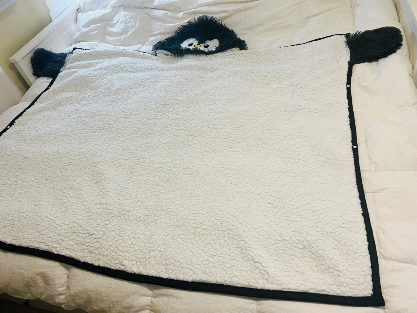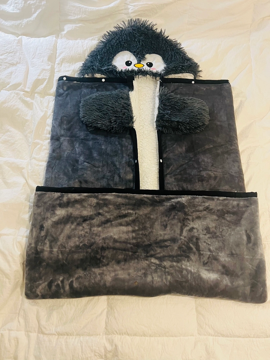 Cozy wearable blanket. Features a cute penguin face and fluffy sleeves. Very think and soft. Never used. Perfect for snuggling up on the couch. Full size adult.