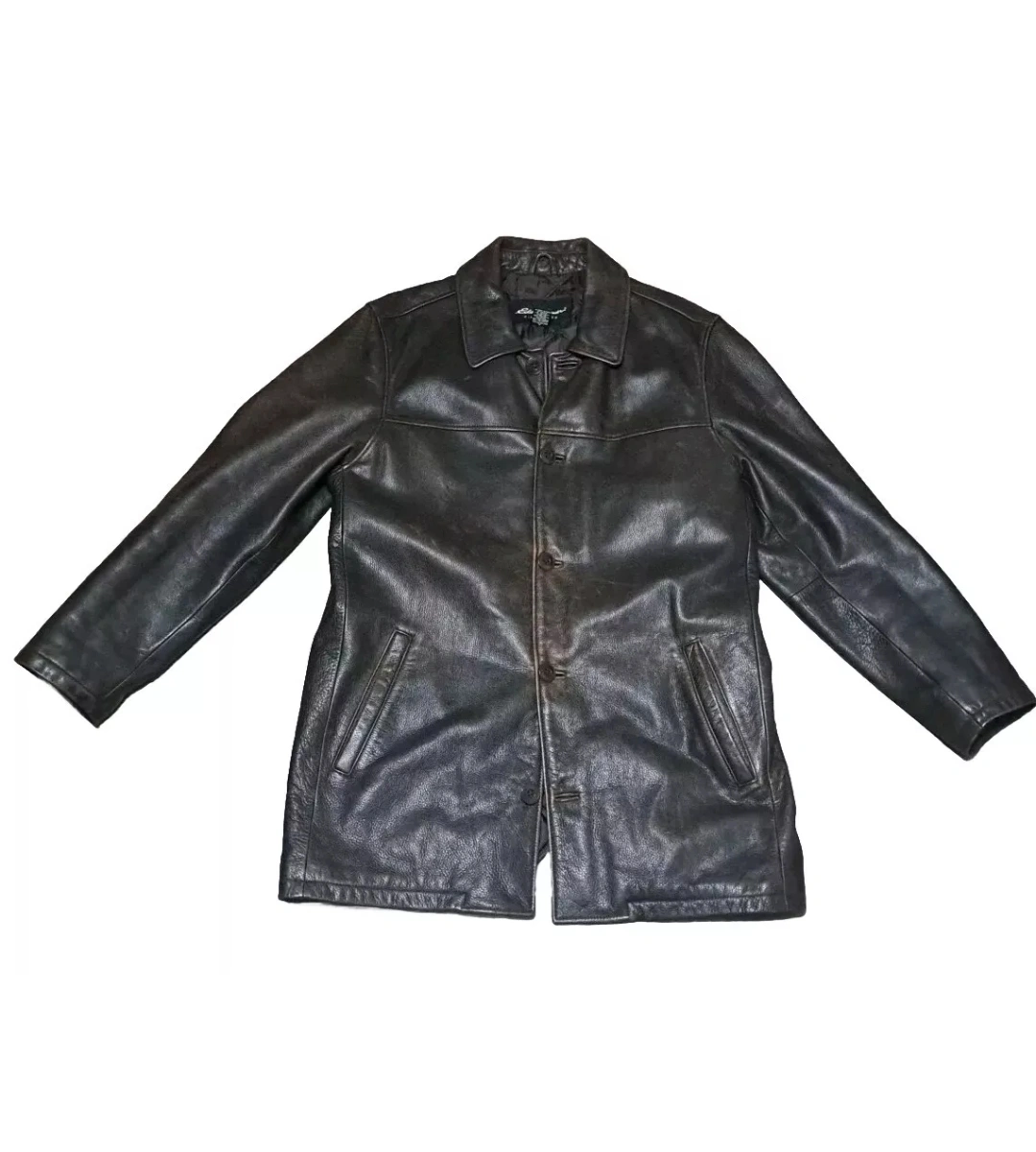 Classic men's leather jacket. Features a button front closure, long sleeves, and pockets. Excellent for layering. like new