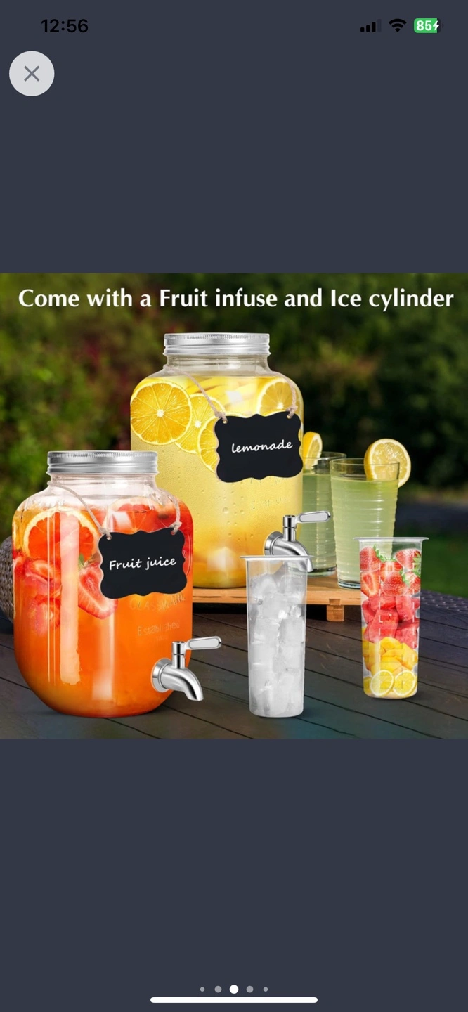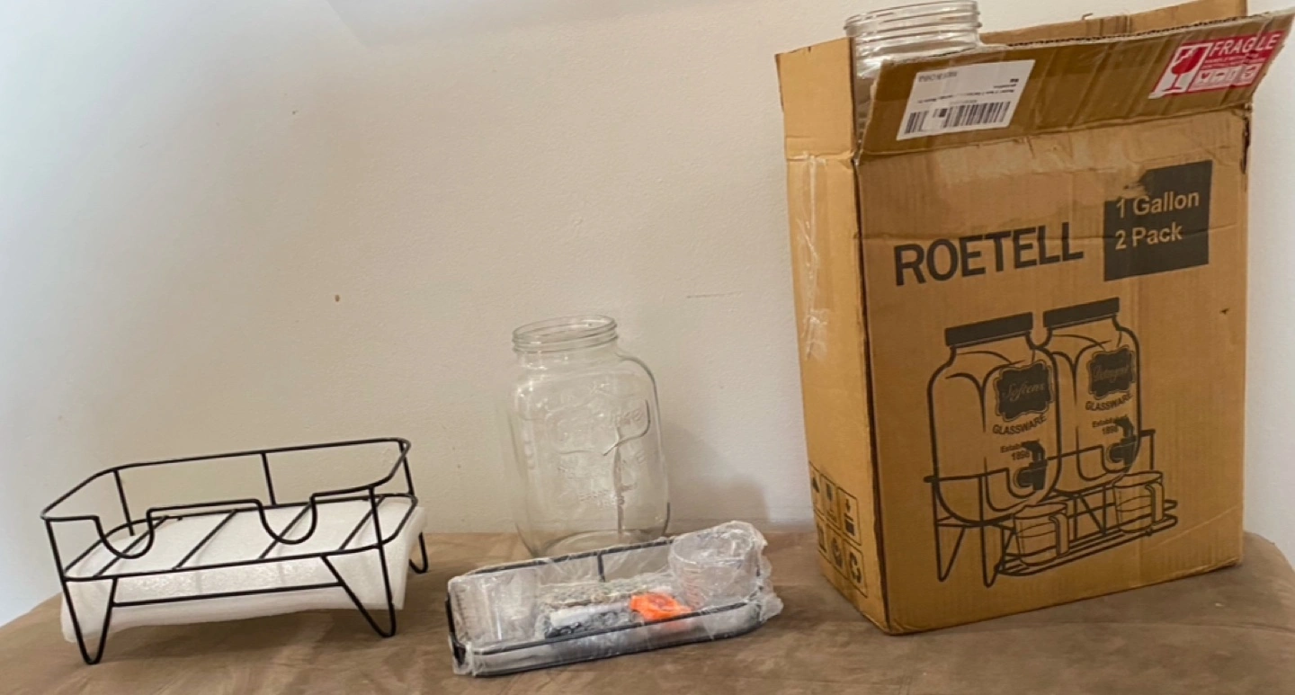 Two 1-gallon glass beverage dispensers. Includes metal stand, two chalkboard labels, and ice cylinders. Perfect for parties or everyday use. New in box.