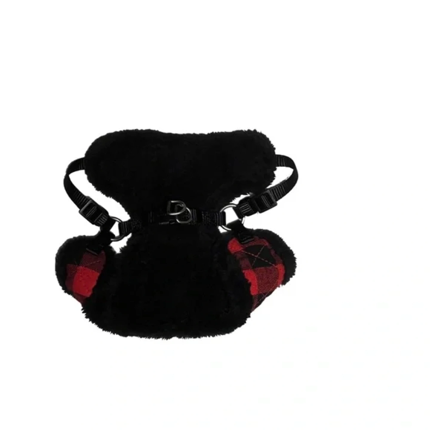 Small dog harness. Red and black buffalo plaid quilted cotton exterior. Soft black faux fur interior. Adjustable straps. Measures approximately 7 inches across the back and 17 inches around the chest.