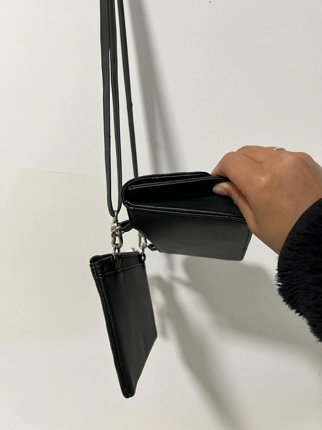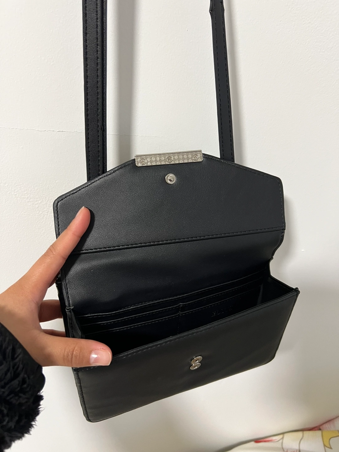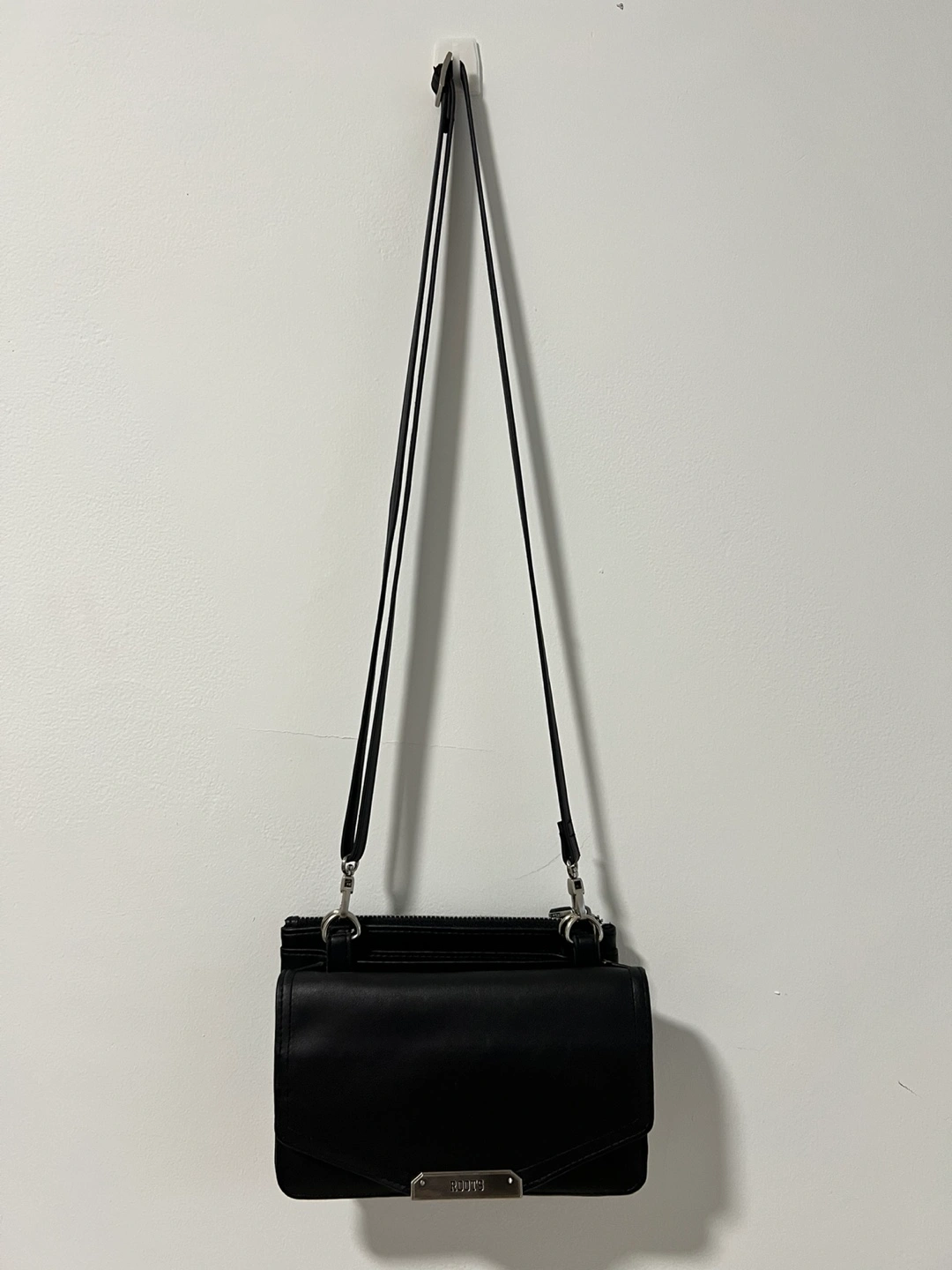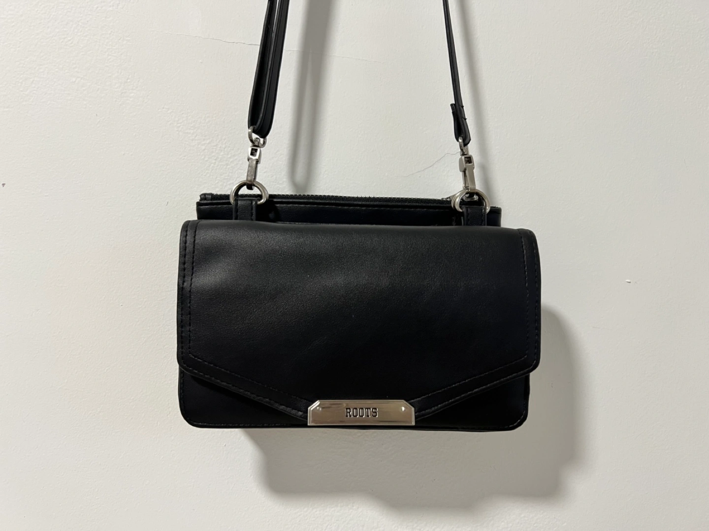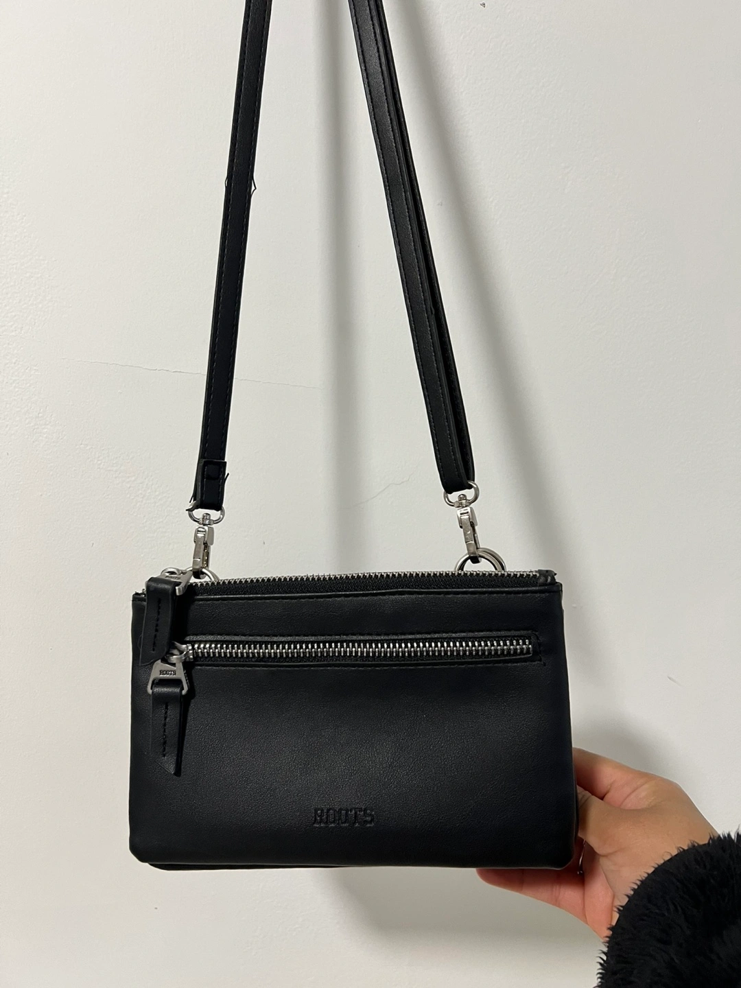 747Black leather crossbody bag. Features multiple compartments and zipper closures. Adjustable strap. Excellent for everyday use. Price is firm. Pick up at Bathurst & St Clair