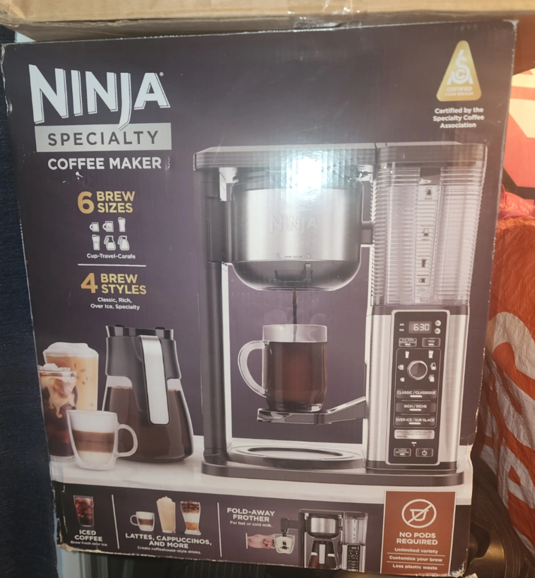 New Ninja Specialty Coffee Maker. Makes six brew sizes and four brew styles. Includes frother. No pods required. Box shows some shelf wear.