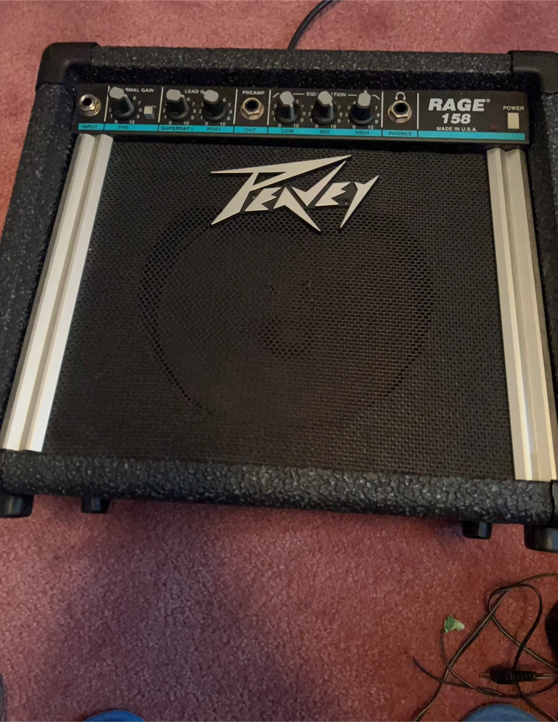 This is a Peavey Rage 158 guitar amplifier. It's a compact combo amp with multiple control knobs for gain, preamp, and equalization. It also features a headphone jack.