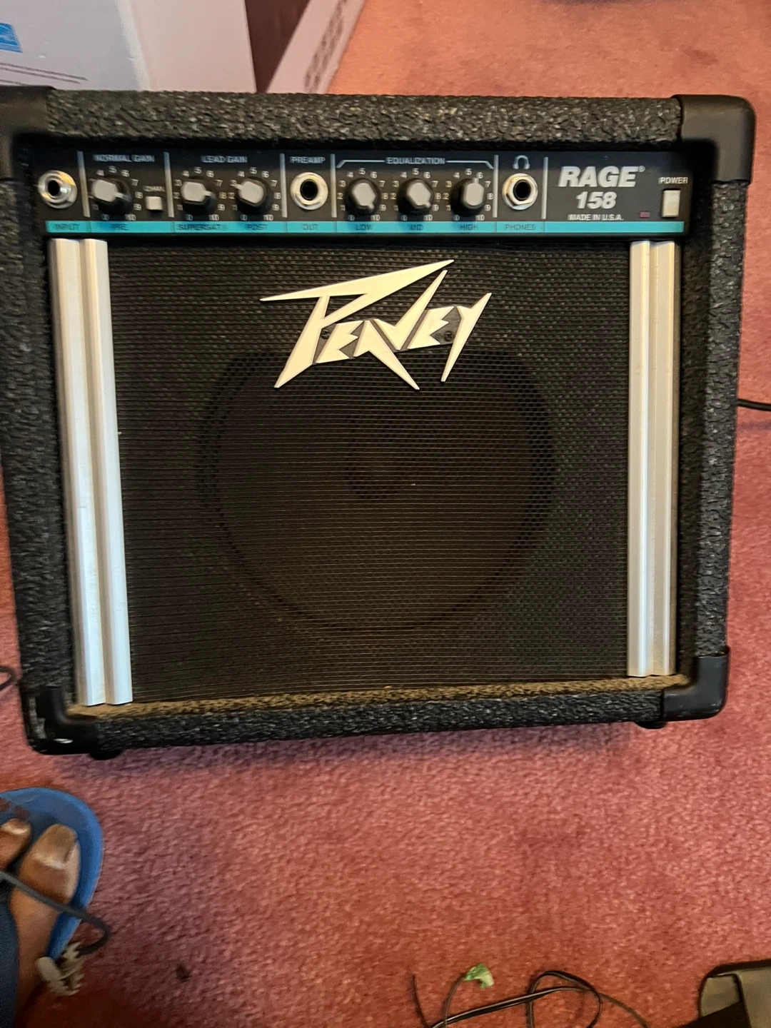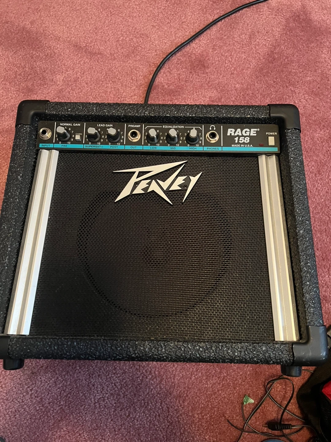 This is a Peavey Rage 158 guitar amplifier. It's a compact combo amp with multiple control knobs for gain, preamp, and equalization. It also features a headphone jack.
