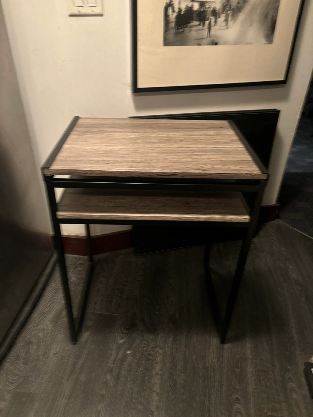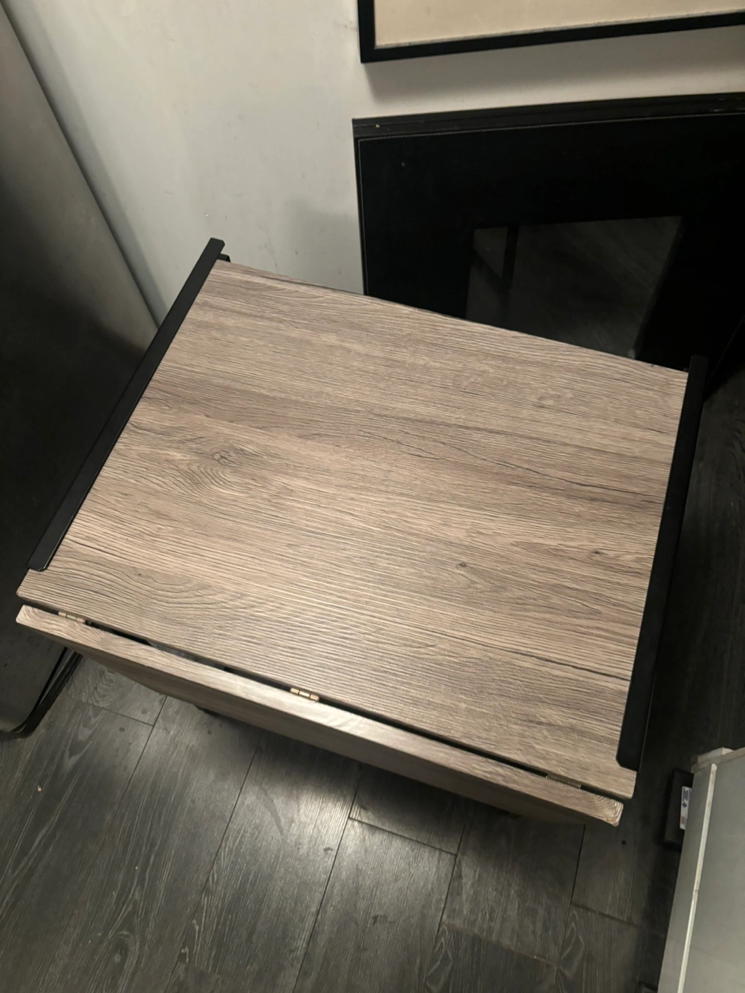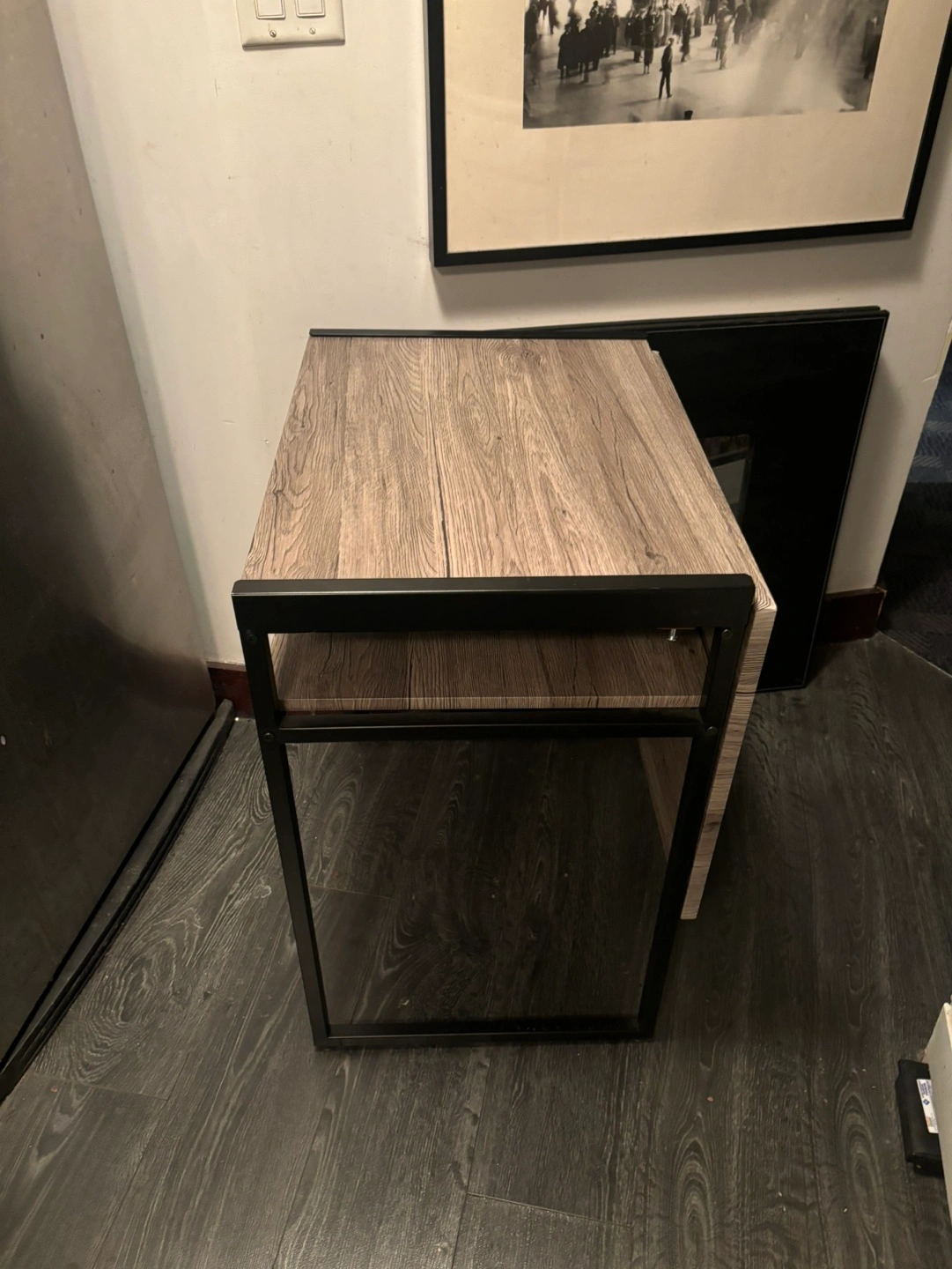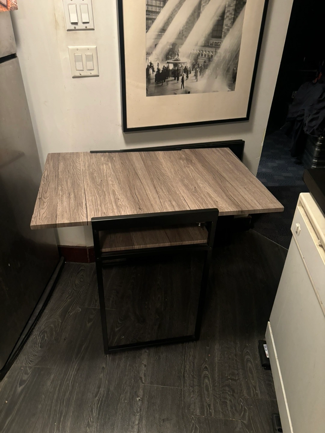 Space-saving foldable table. Features a drop-leaf design and a lower shelf for storage. Black metal frame. Grey wood-look top. Easy to fold away. Tiny bit of wear in corner shown in pic other overall it’s in nice condition