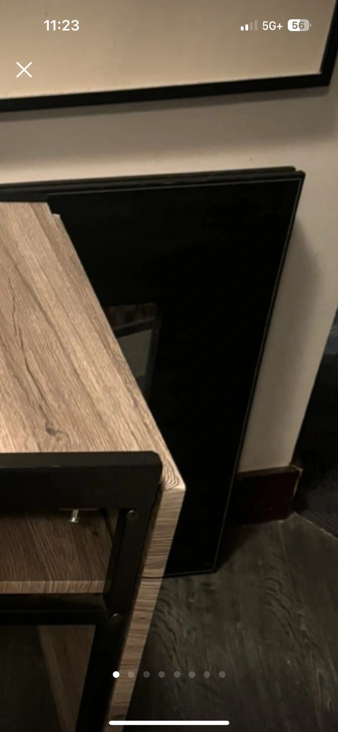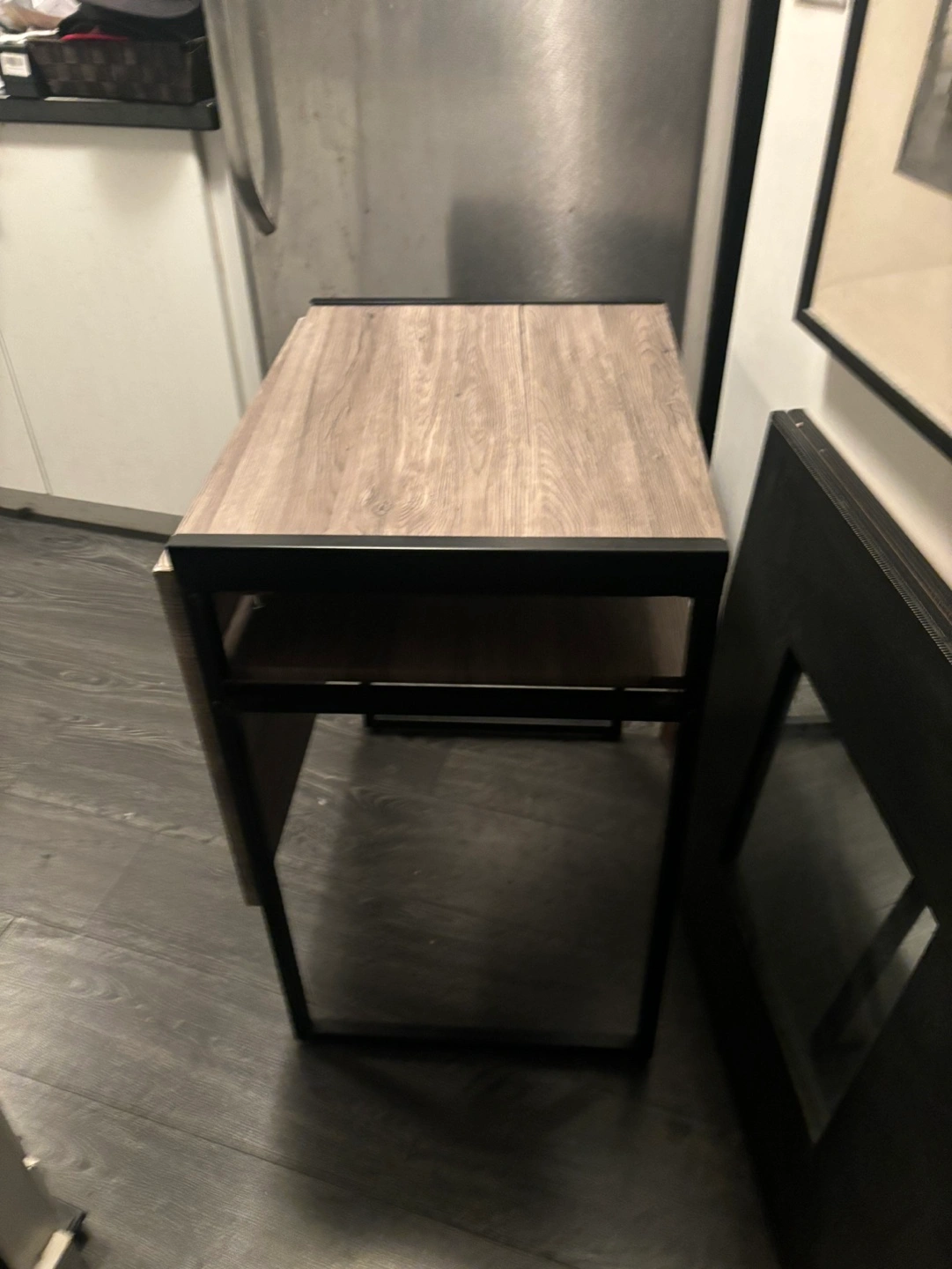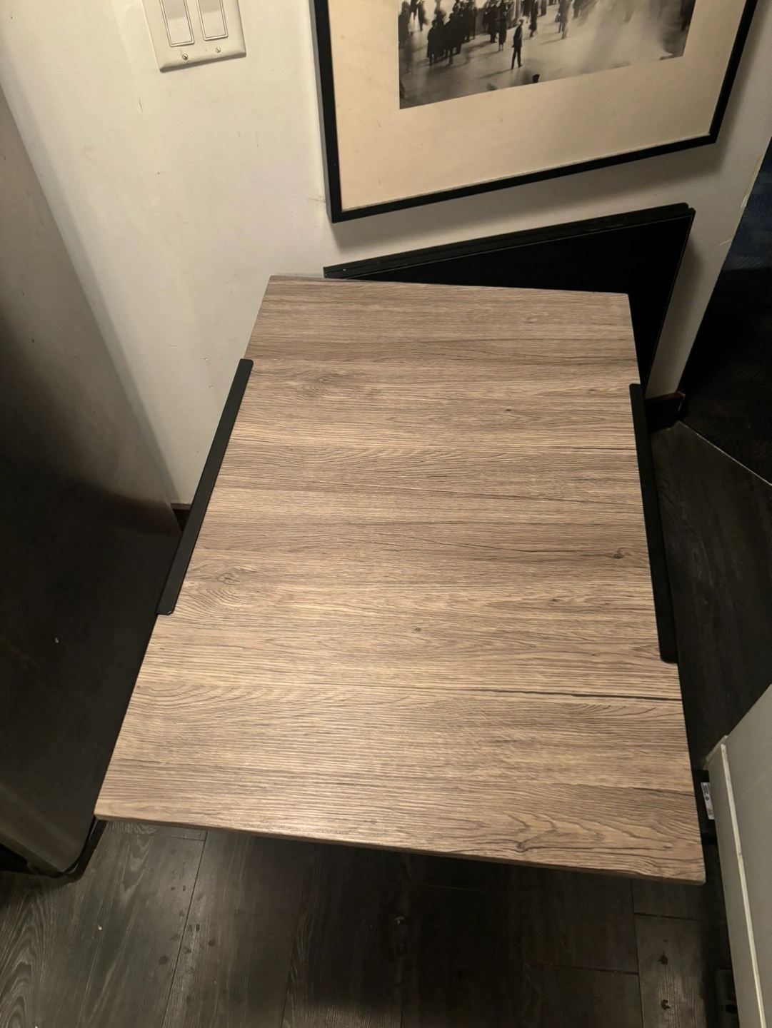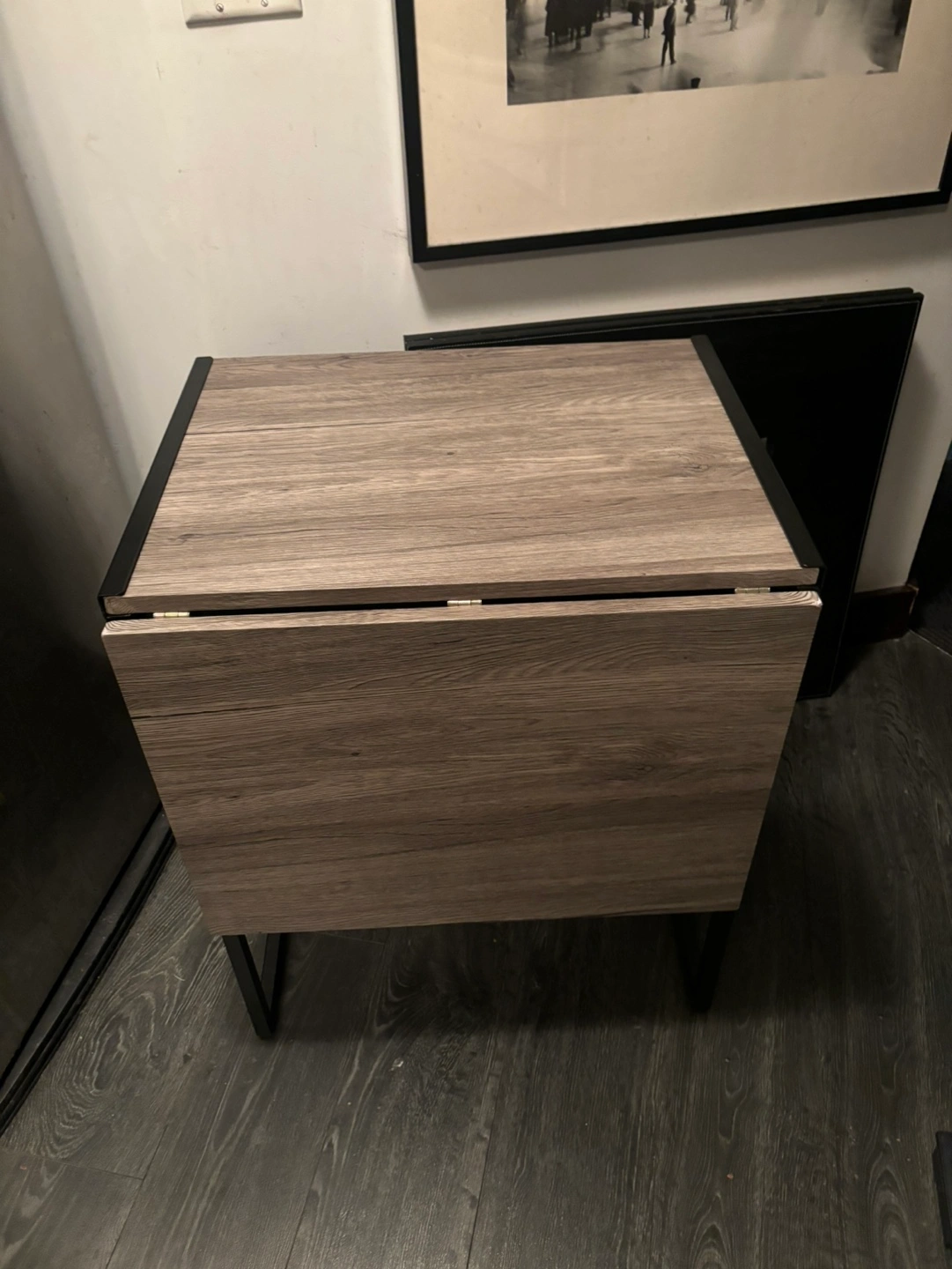 Space-saving foldable table. Features a drop-leaf design and a lower shelf for storage. Black metal frame. Grey wood-look top. Easy to fold away. Tiny bit of wear in corner shown in pic other overall it’s in nice condition