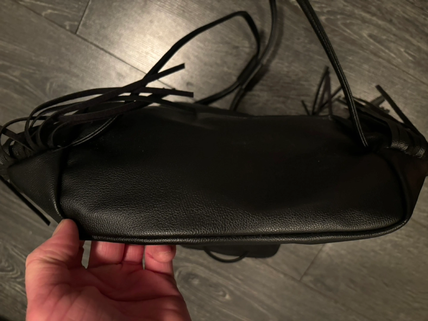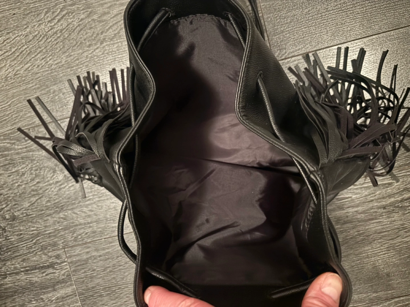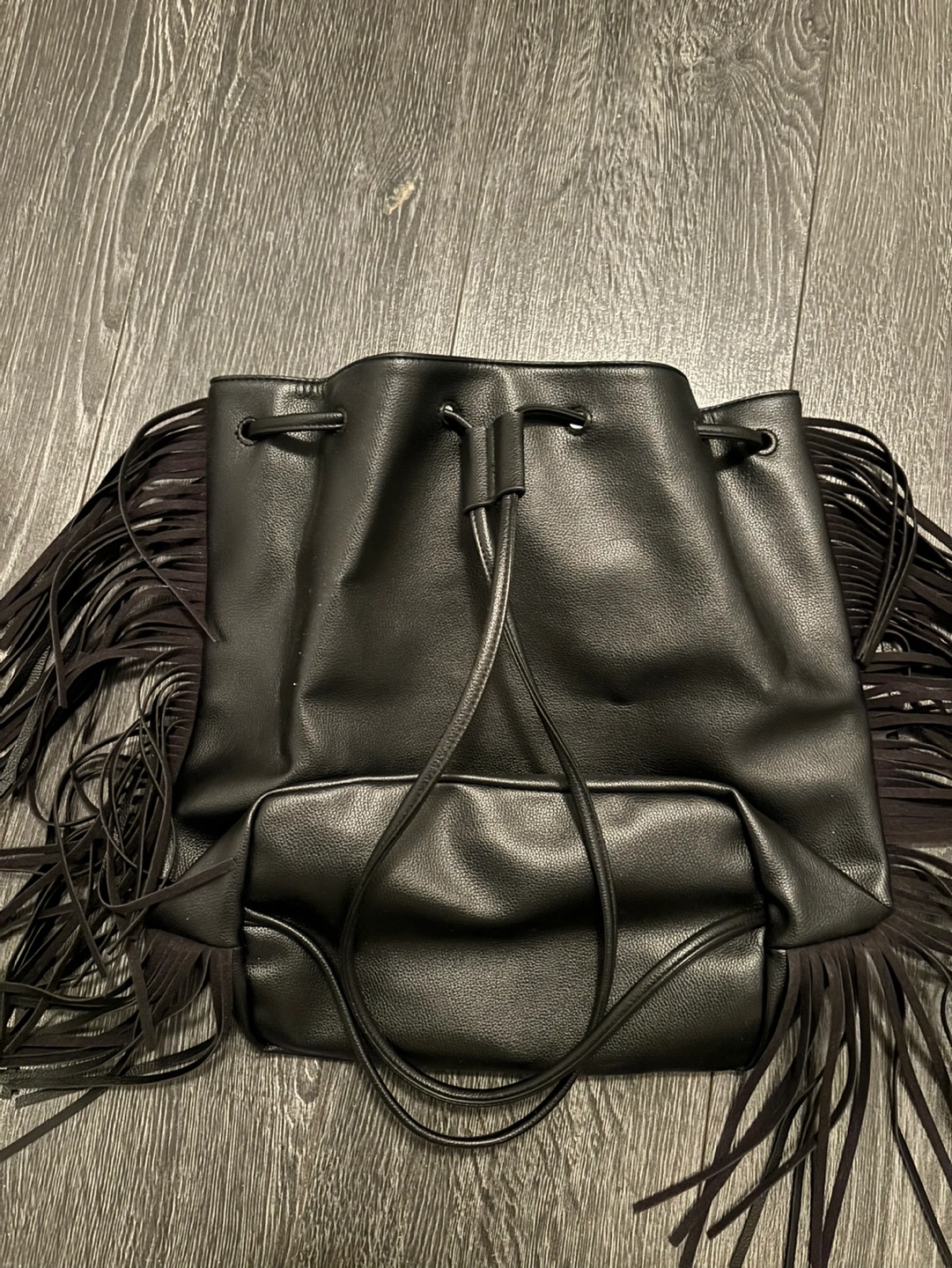 NWOT Black faux leather bucket bag. Features a drawstring closure and fringe detailing. Excellent for everyday use.