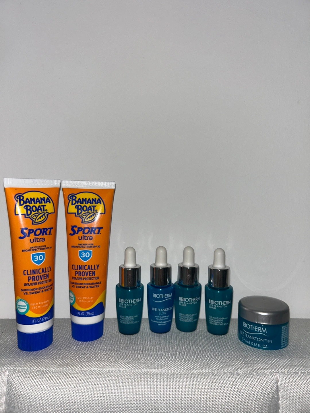 Two tubes of Banana Boat Sport Ultra Sunscreen SPF 30. Four Biotherm Life Plankton Elixir serums and one Biotherm Life Plankton Eye cream.