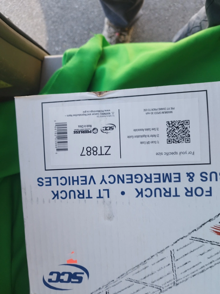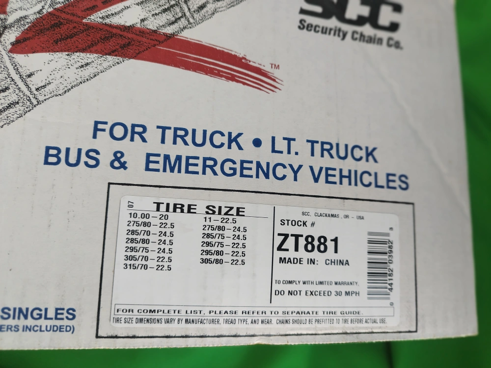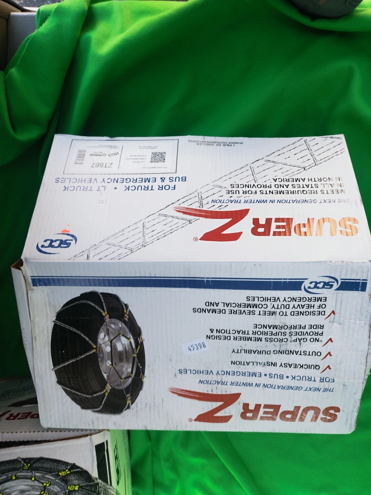 New in box. Super Z tire chains for light trucks, trucks, buses and emergency vehicles. Includes all necessary hardware. See box for tire size compatibility.
