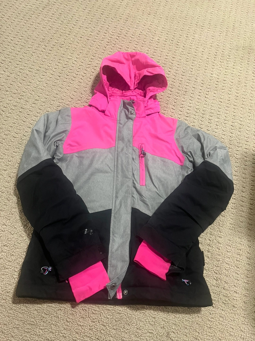 Ski jacket. Pink, grey, and black. Size medium. Waterproof and breathable. Features a hood and zipper closure. Good condition. Would fit an 8-10 year old