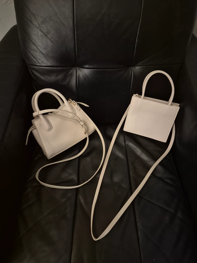 Pair of off-white small handbags. One is slightly larger than the other. Both feature a zipper closure and a removable shoulder strap. Great for everyday use.