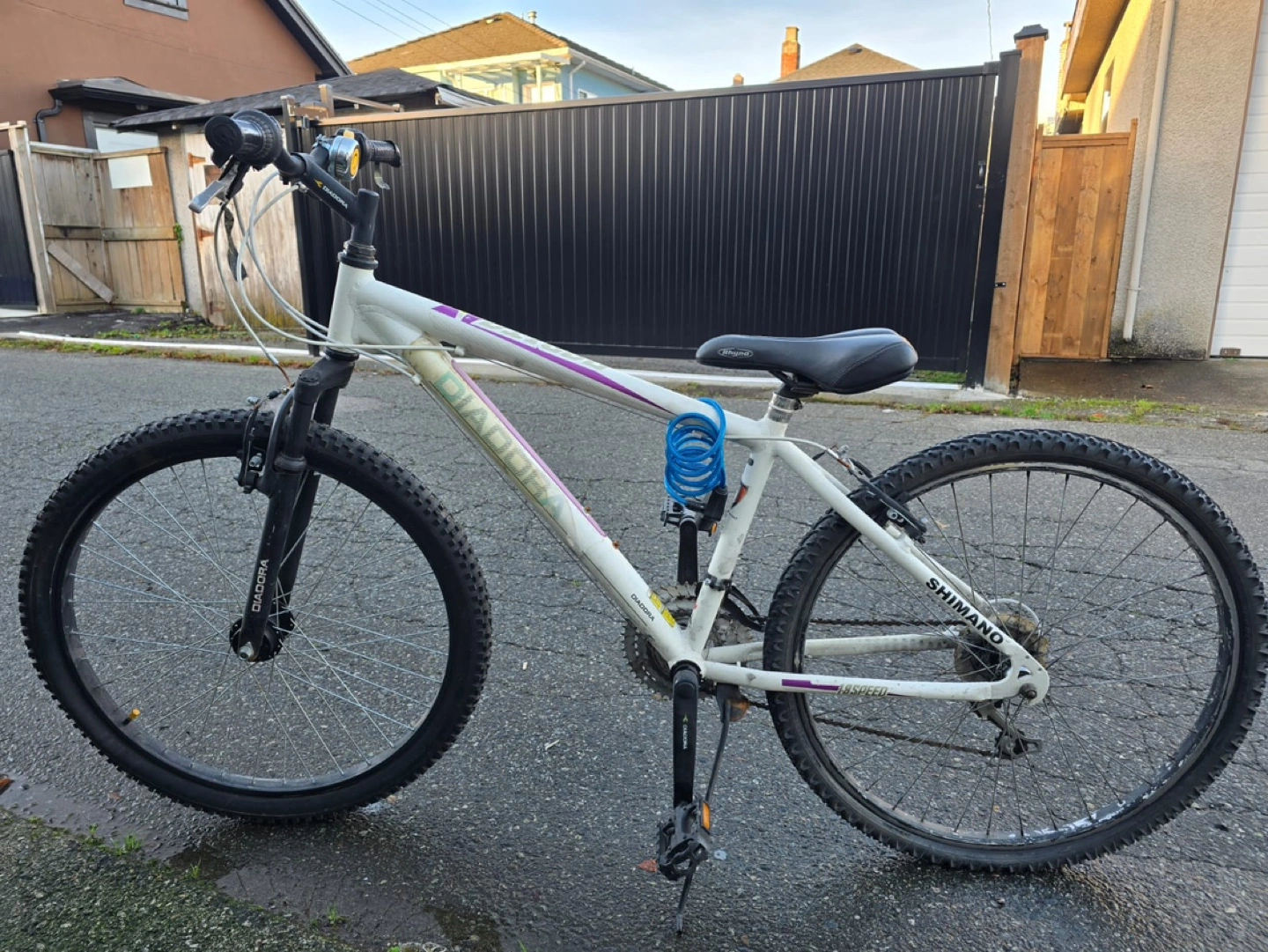 White mountain bike. Shimano components. 28” inseam. Front suspension forks.