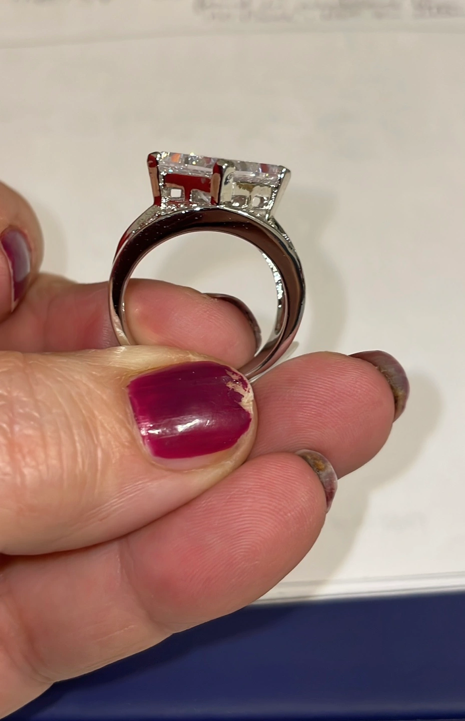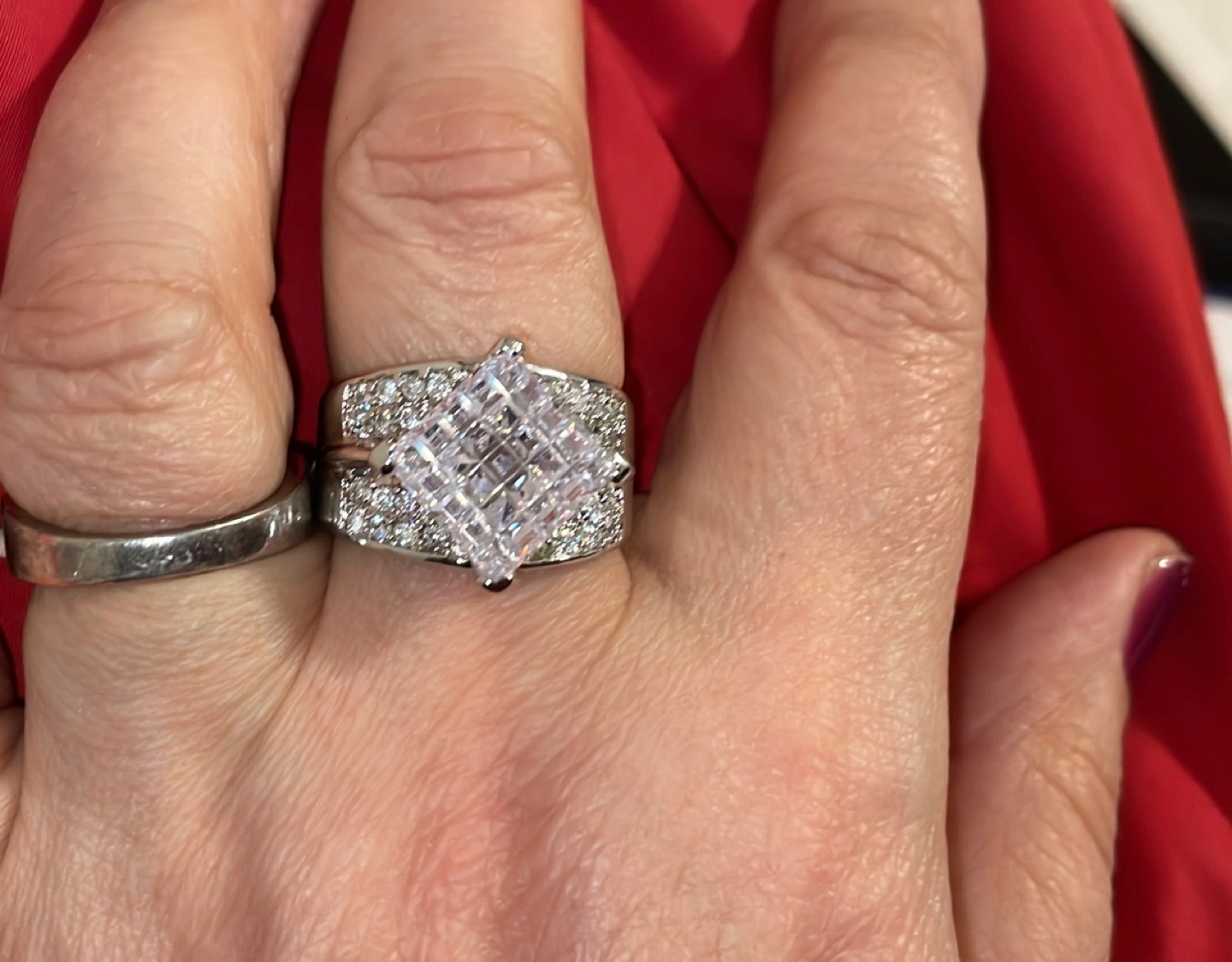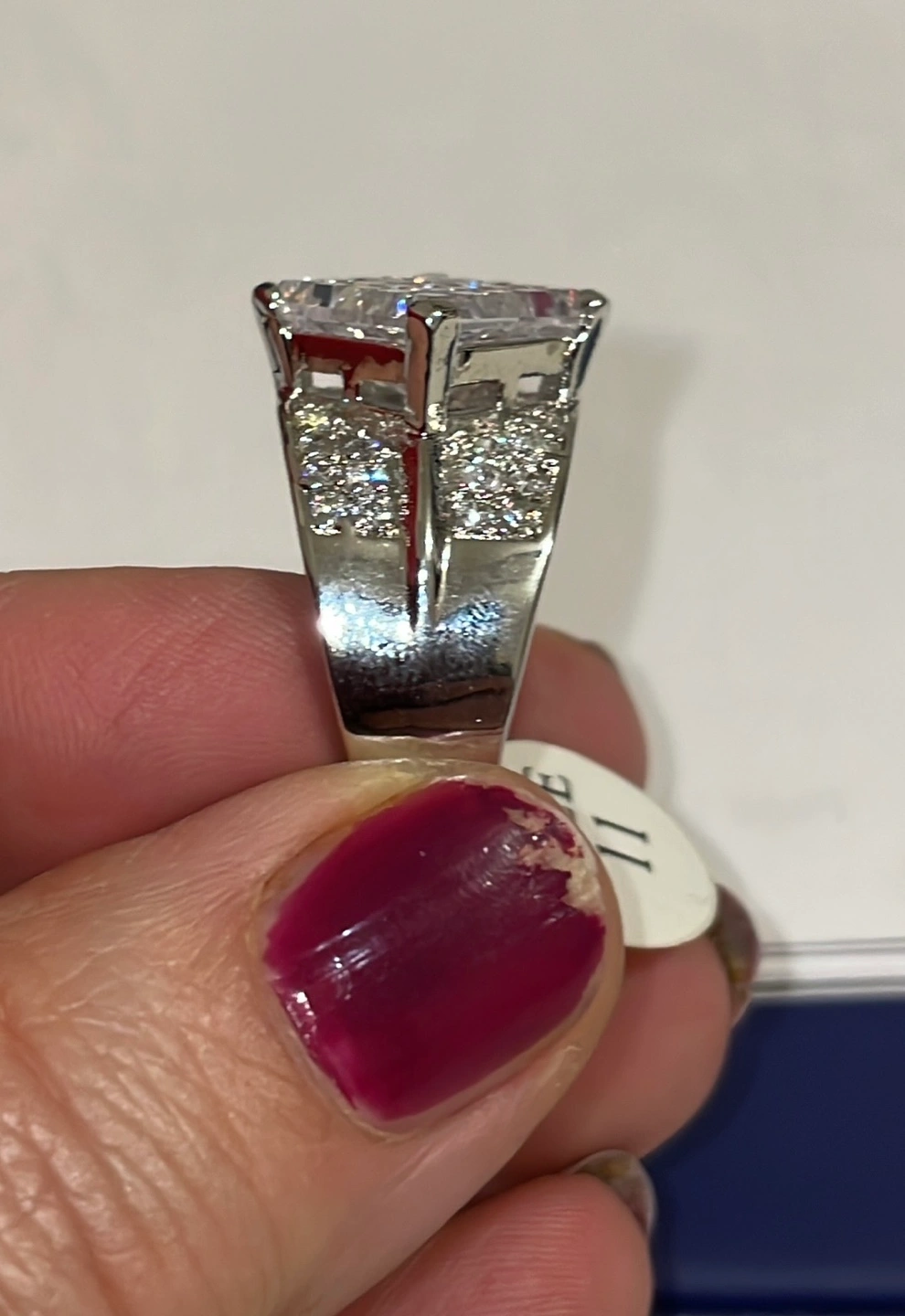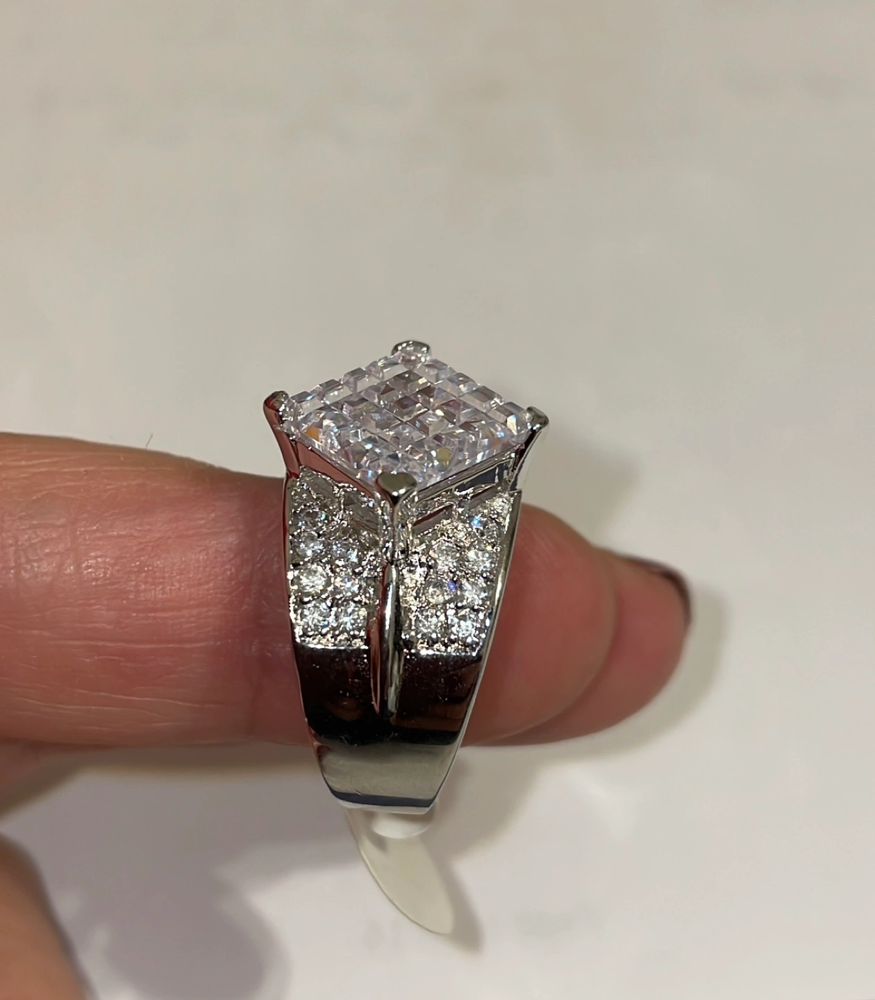 887925 silver stamped ring. Features a large princess-cut cubic zirconia centre stone, accented by smaller stones. Elegant design. Looks great worn alone or stacked