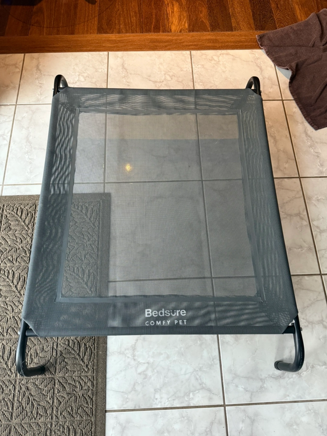 Elevated dog bed. Black metal frame. Grey mesh fabric. Lightweight and easy to clean. Only used a few times. We have two medium size (as shown) and one small size. $20, $45, $45