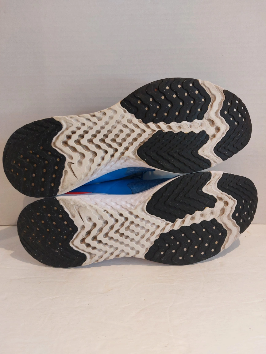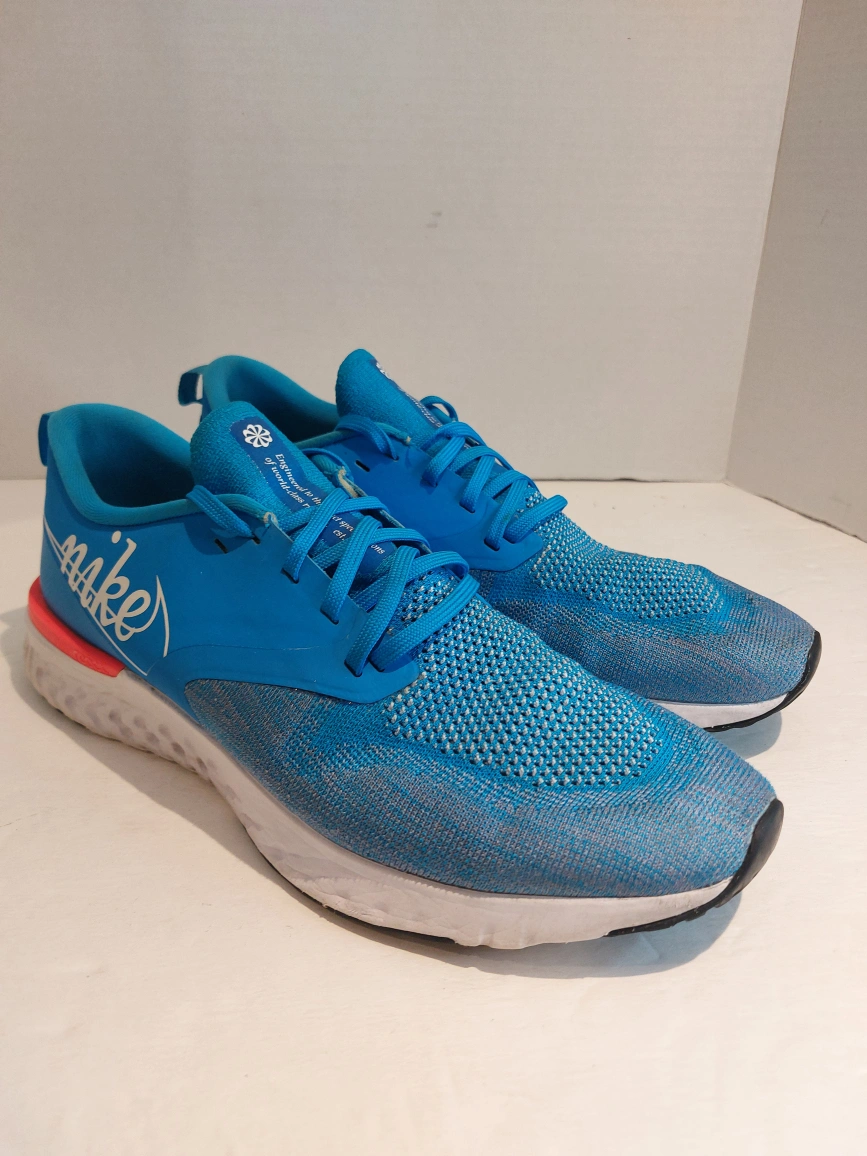 Men's Nike running shoes. Bright blue knit upper. Orange accents. White midsole. In Very Good condition.