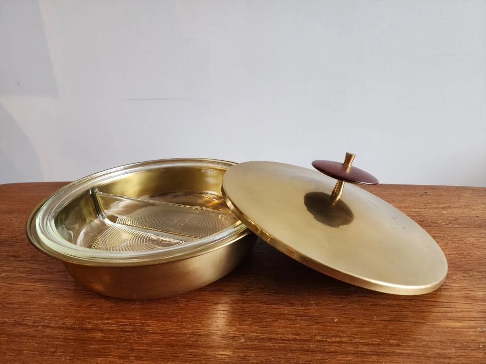 Vintage brass chafing dish/ serving bowl. Features a divided glass insert and a brass lid with a wooden knob. Perfect to keep food warm at the table.