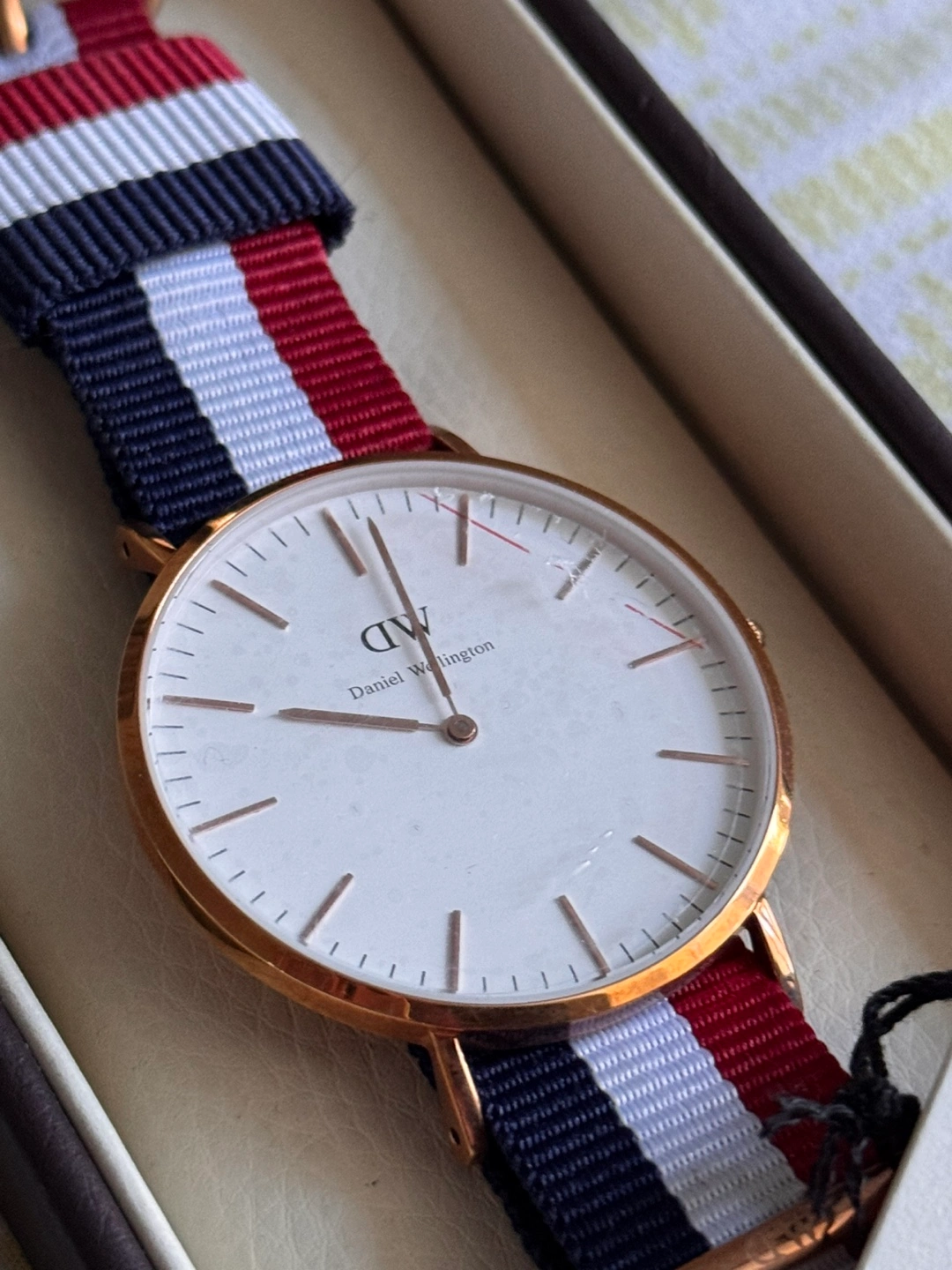 BRAND NEW Rose gold watch with white face. Red, white, and navy striped NATO strap. Comes in original box with protection still on the watch face. Tumblr aesthetic