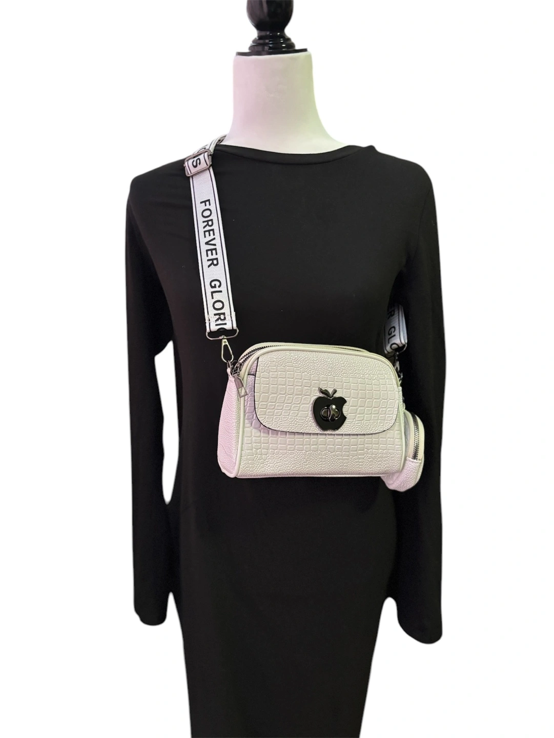 225Adorable white crossbody bag. Features a crocodile-embossed design and a cute apple-shaped clasp. Includes a detachable smaller pouch. Adjustable strap with Forever Glory branding.