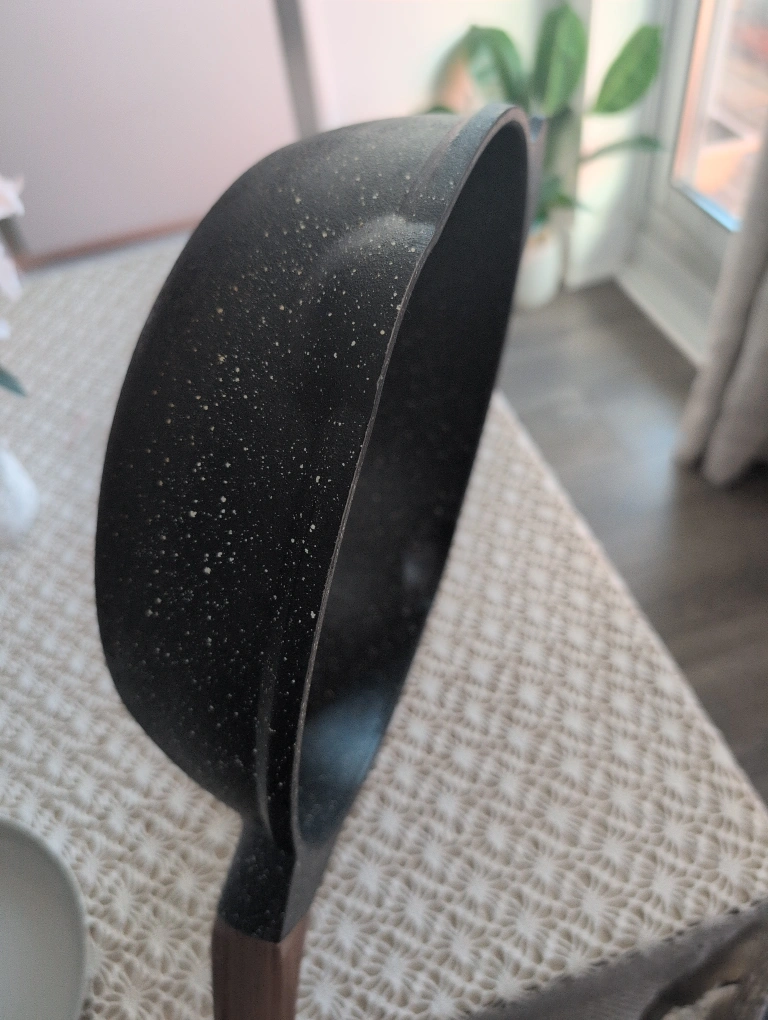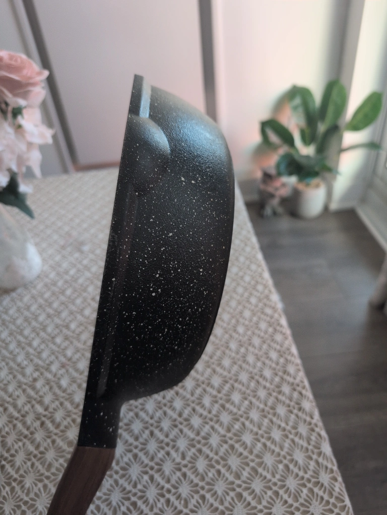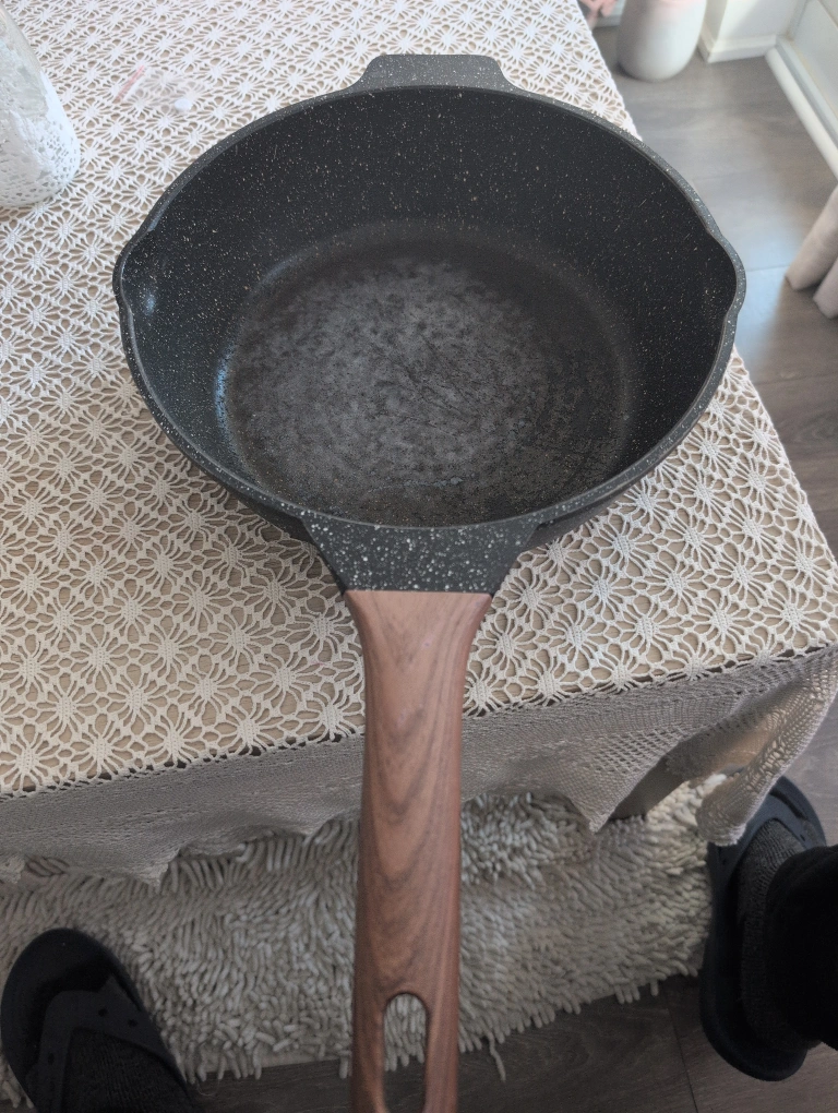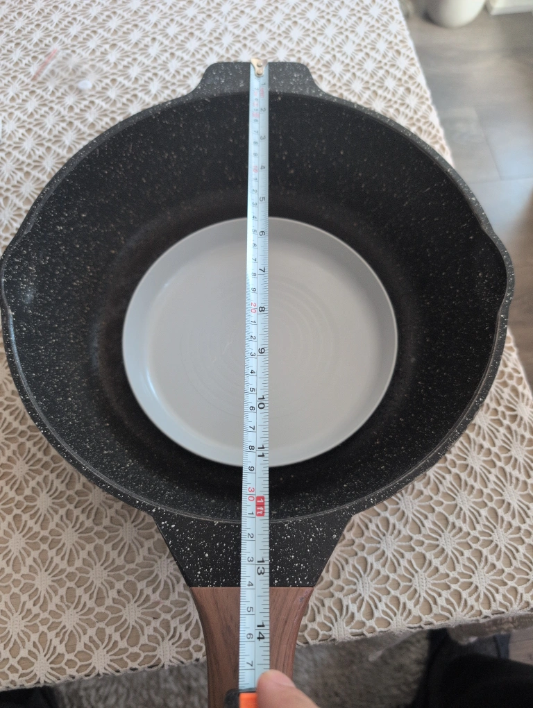 1000+Large frying pan, approximately 11 inches in diameter. Features a speckled granite-like coating and a comfortable wooden handle. Great for everyday cooking. size comparison on last picture. got a cooker as well.