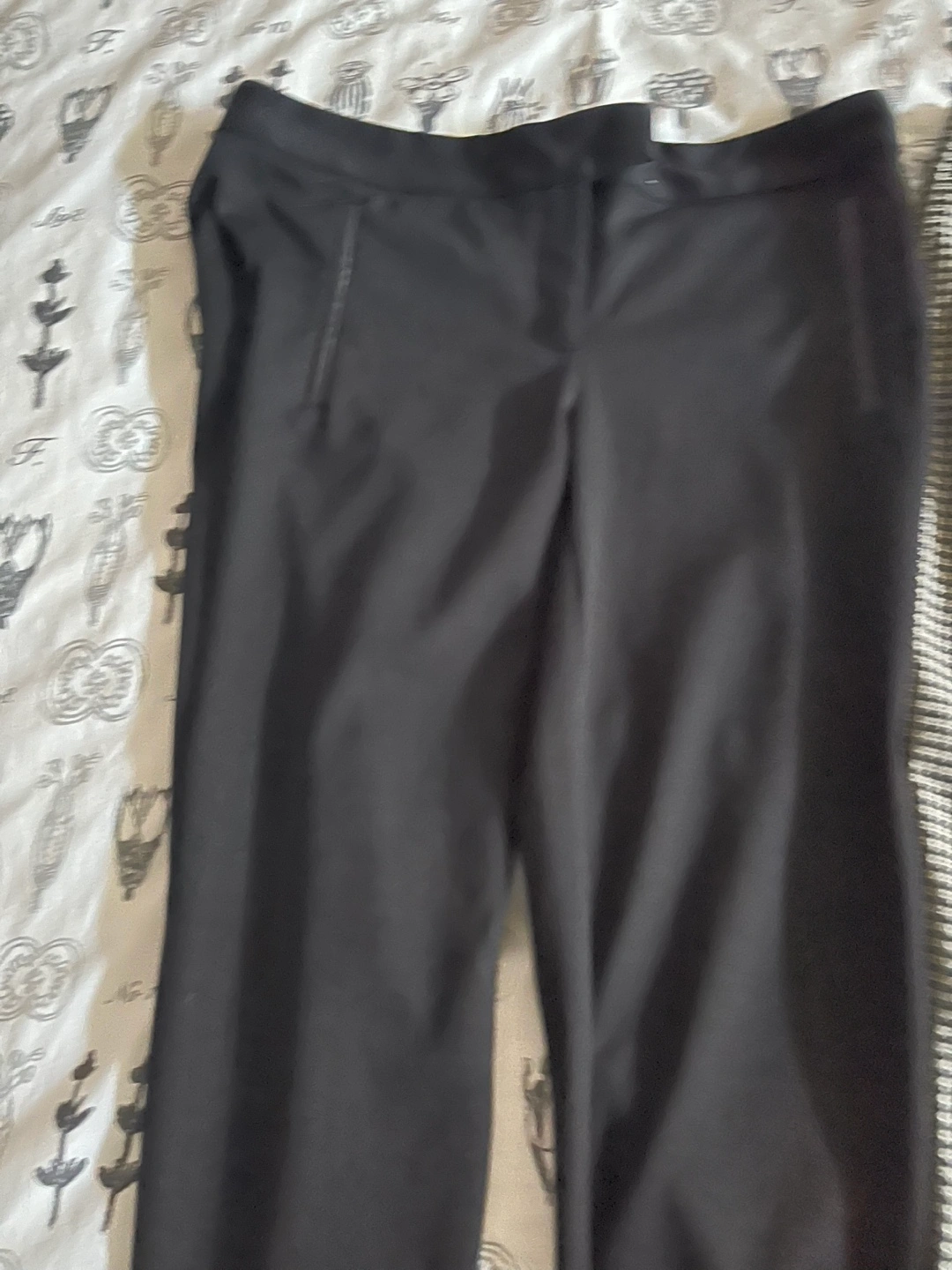 Bundle of three pairs of women's pants. One black, one navy, and one houndstooth pattern.
