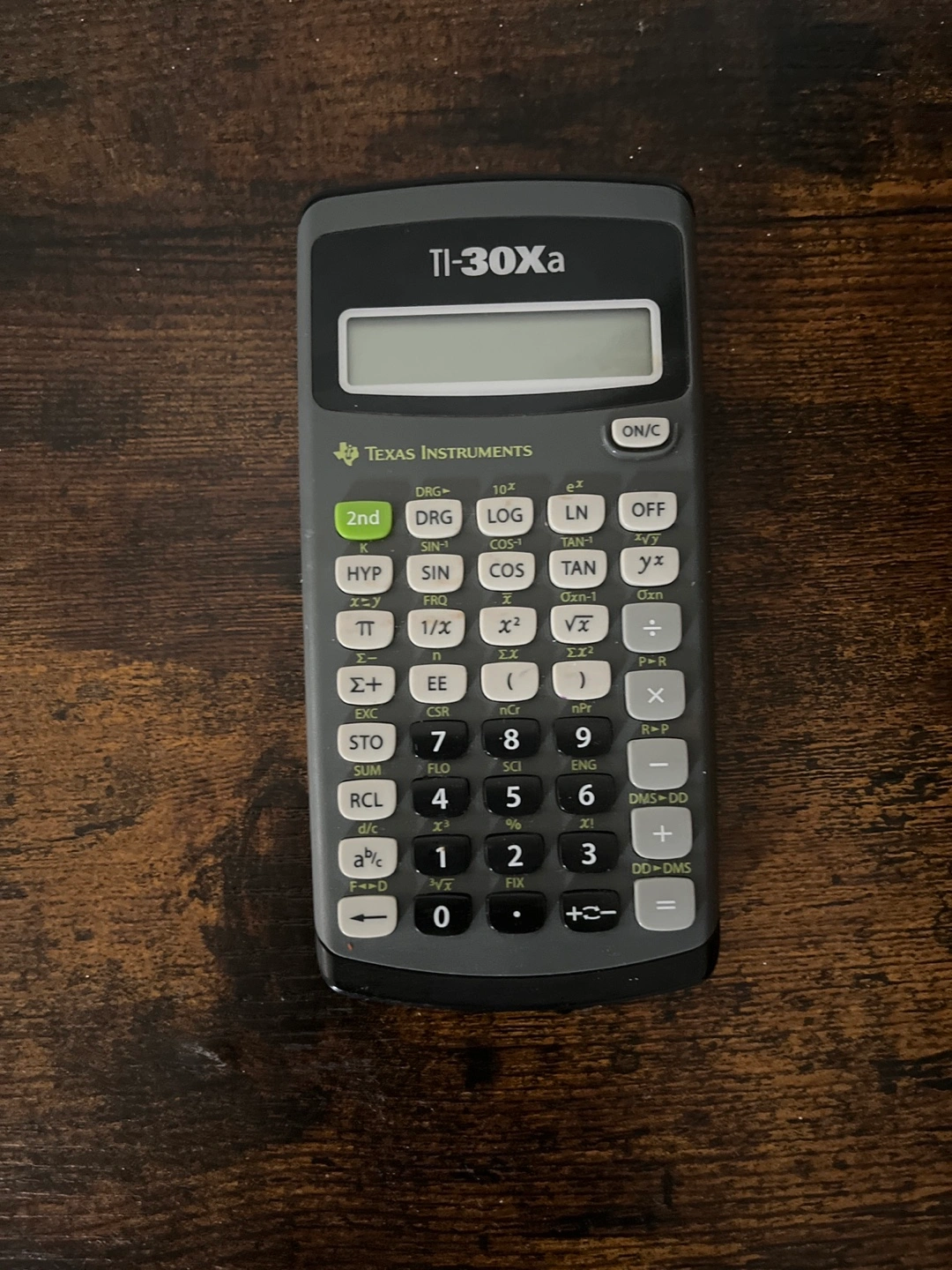 Used TI-30Xa scientific calculator. Gray plastic casing. Standard scientific functions. Good condition.