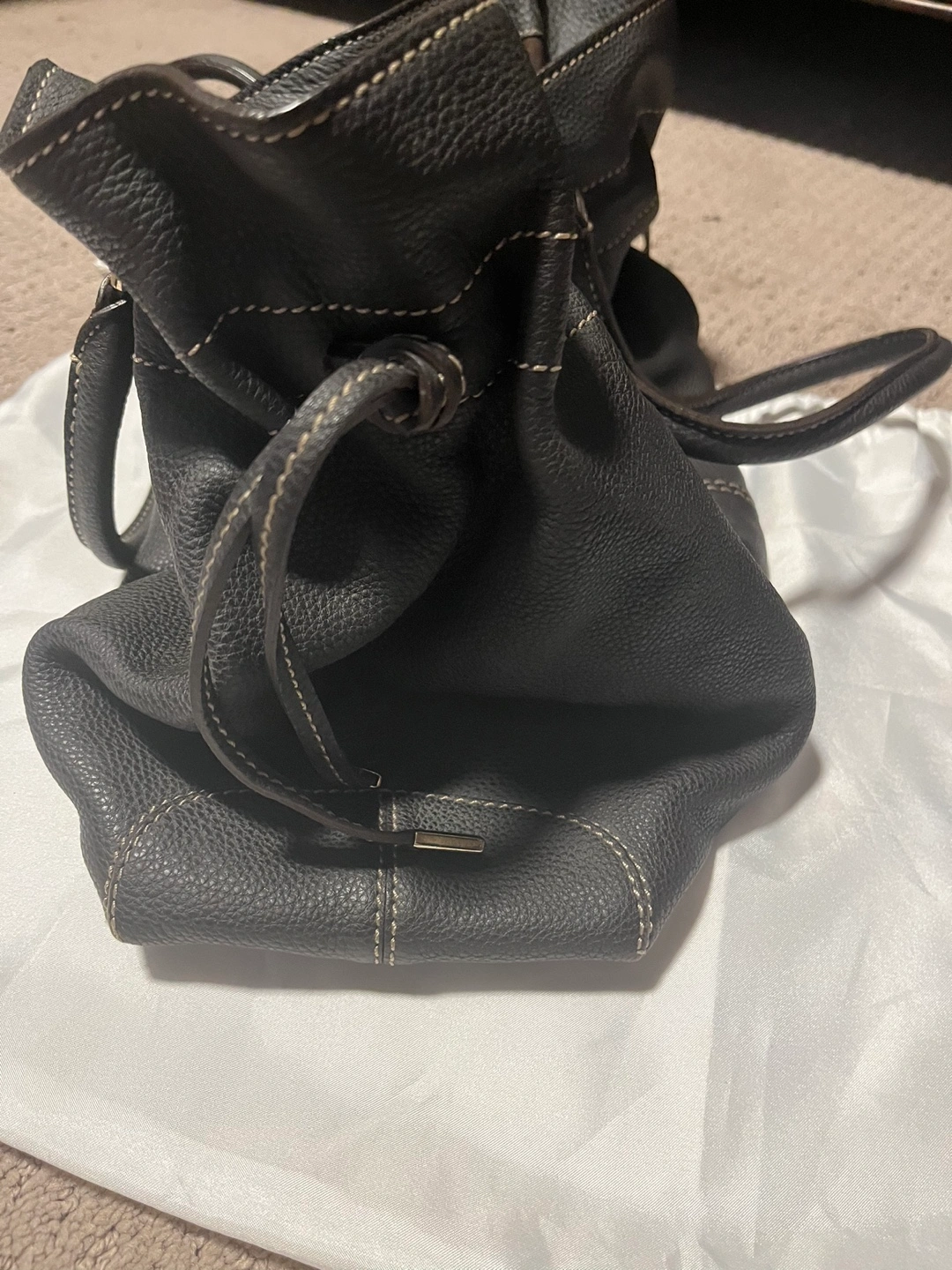 Dark brown leather tote bag. Drawstring closure. Two top handles. Interior pocket. Made in Italy. Includes dust bag.