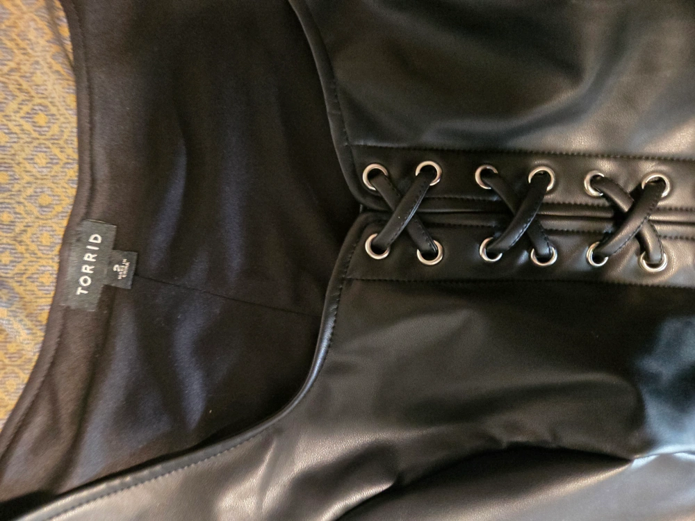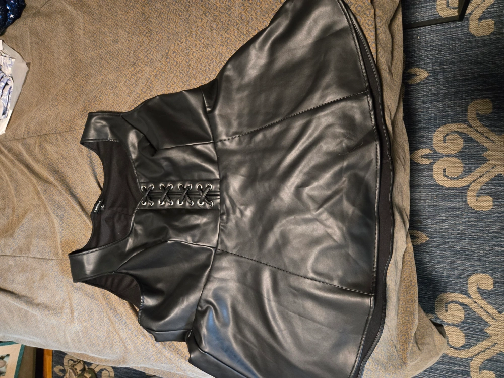 Black faux leather sleeveless top. Features a lace-up corset detail at the front. A-line silhouette. Looks great with jeans or a skirt.