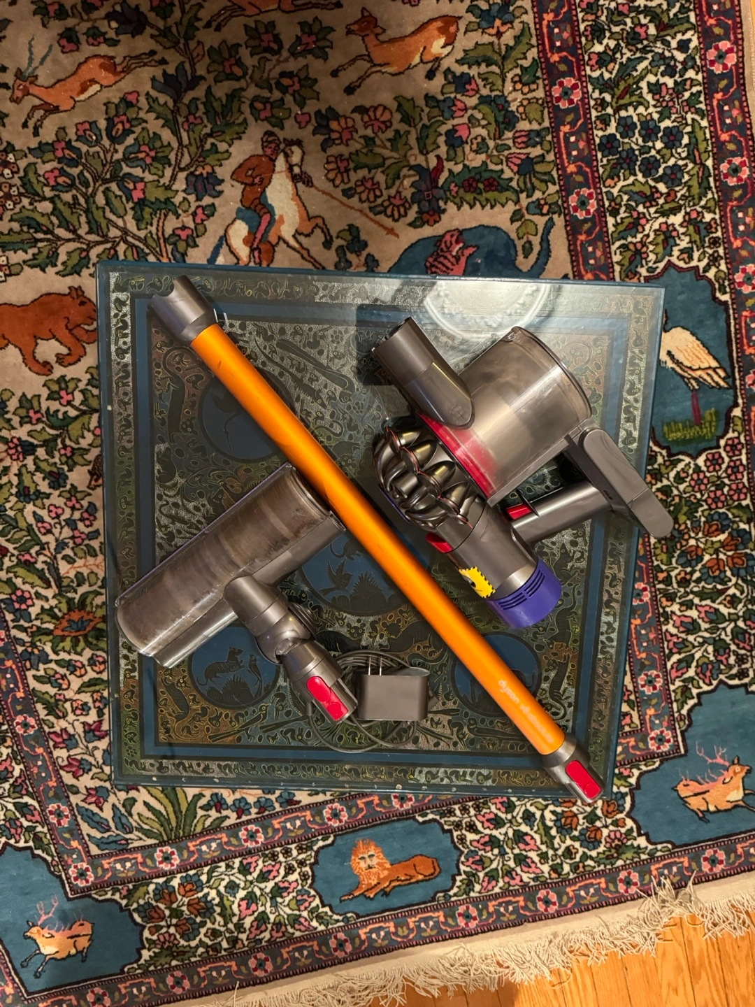Dyson V8 vacuum cleaner attachments and charging dock. Includes wand and floor head. Gently used, battery doesn’t hold a charge. Recently replaced the filter. Can be parted out or battery replaced