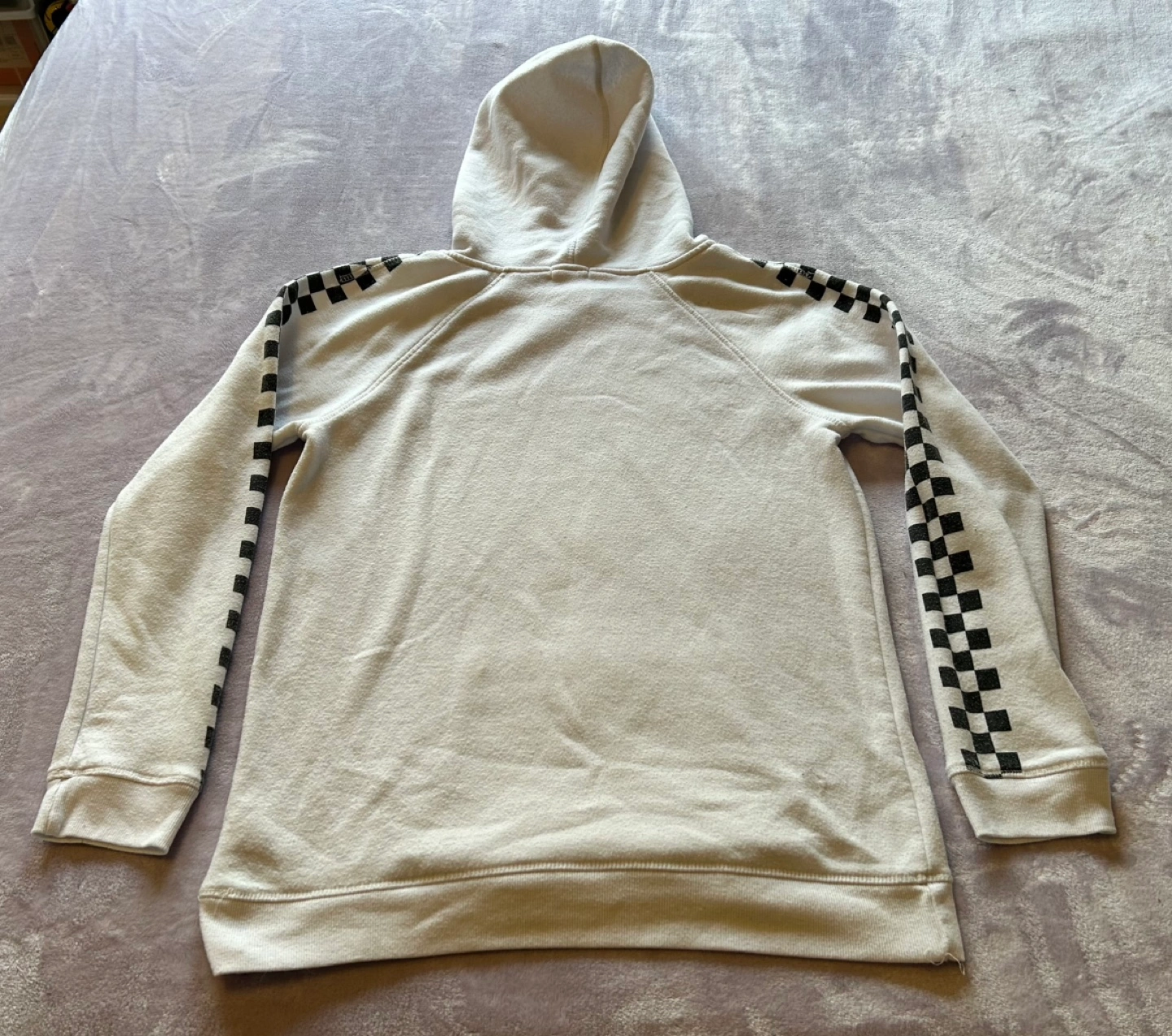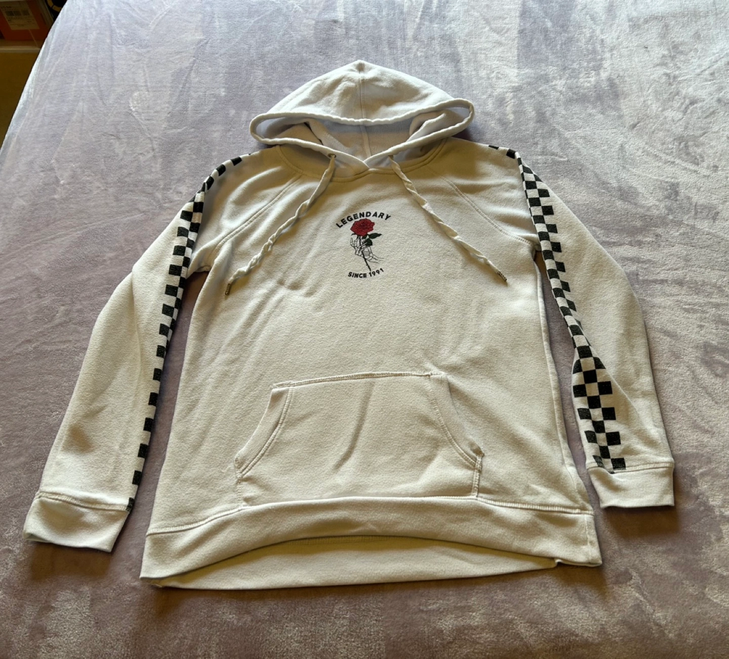 White hoodie featuring a rose and skeleton hand graphic. Checkered detailing on sleeves. Size M