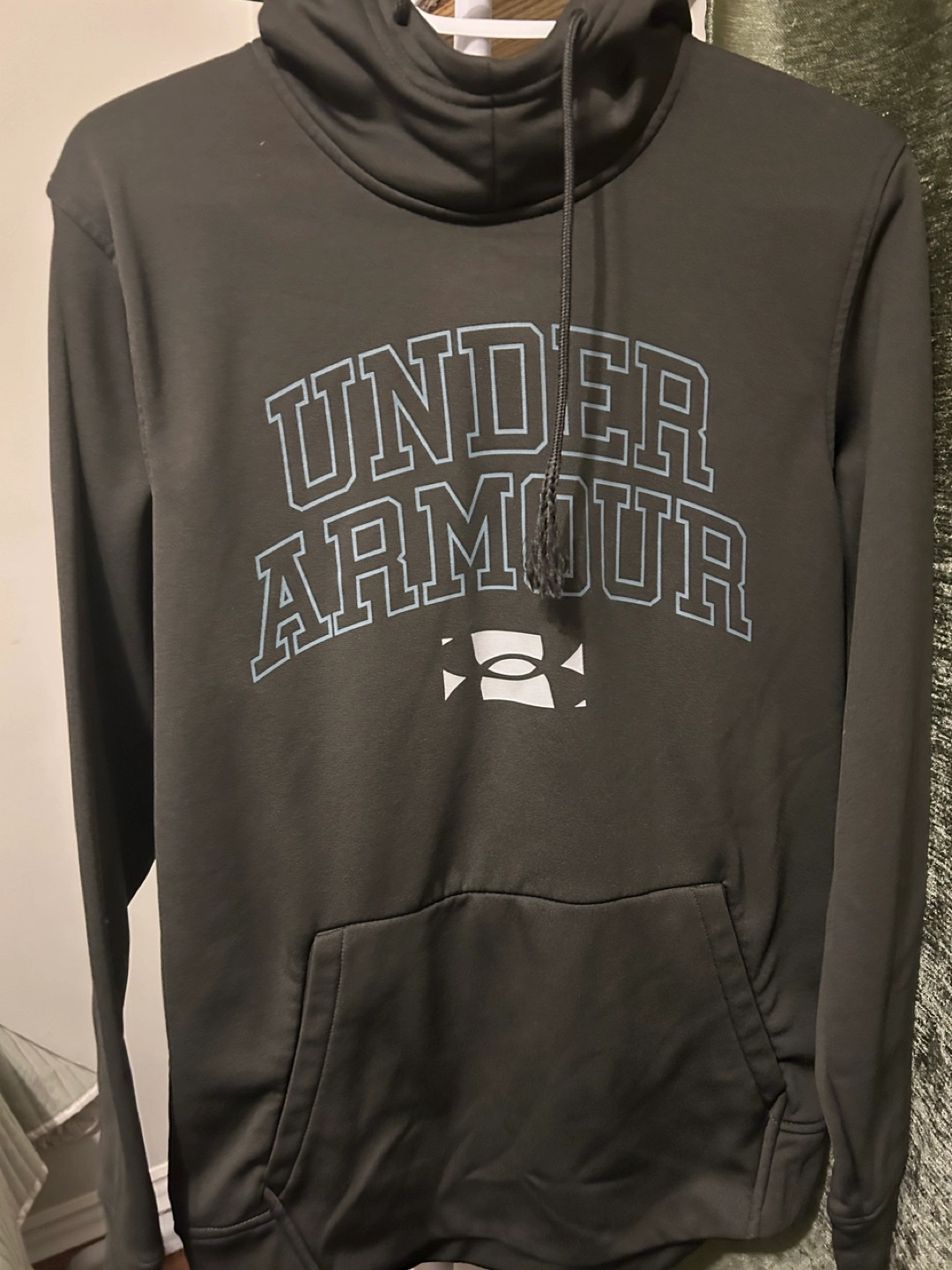 Men's Under Armour hoodie. Dark grey colour. Features a large Under Armour logo on the front. Hooded pullover sweatshirt with kangaroo pocket.