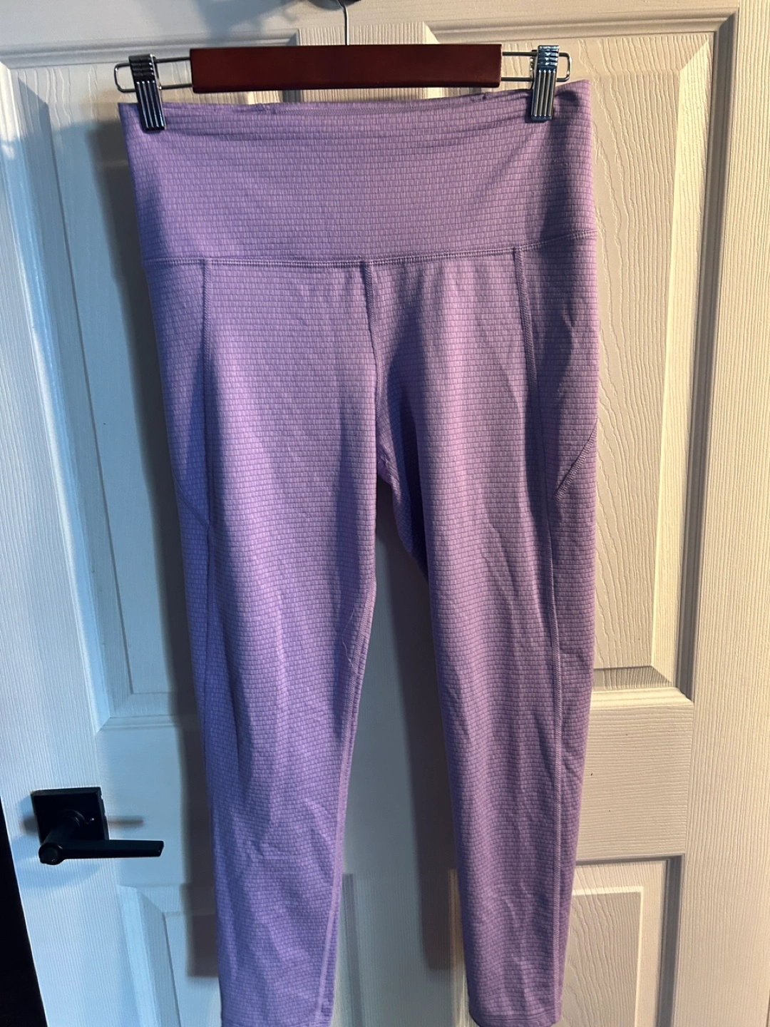 2 Pairs of women's 7/8 length athletic leggings. Purple and grey options available. Features a high waistband and side pockets.