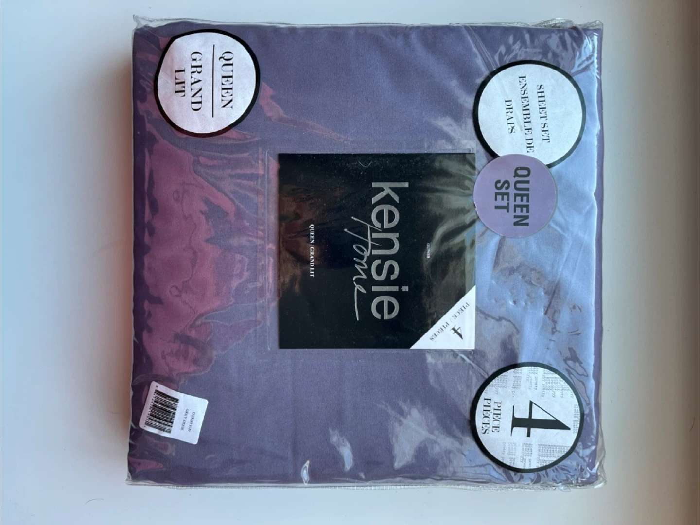 This is a Kensie Home 4-piece sheet set in Queen size. The set includes a sheet set and comes in a purple color. It's a grey ridge collection.