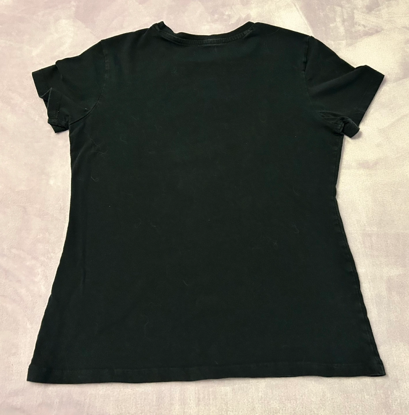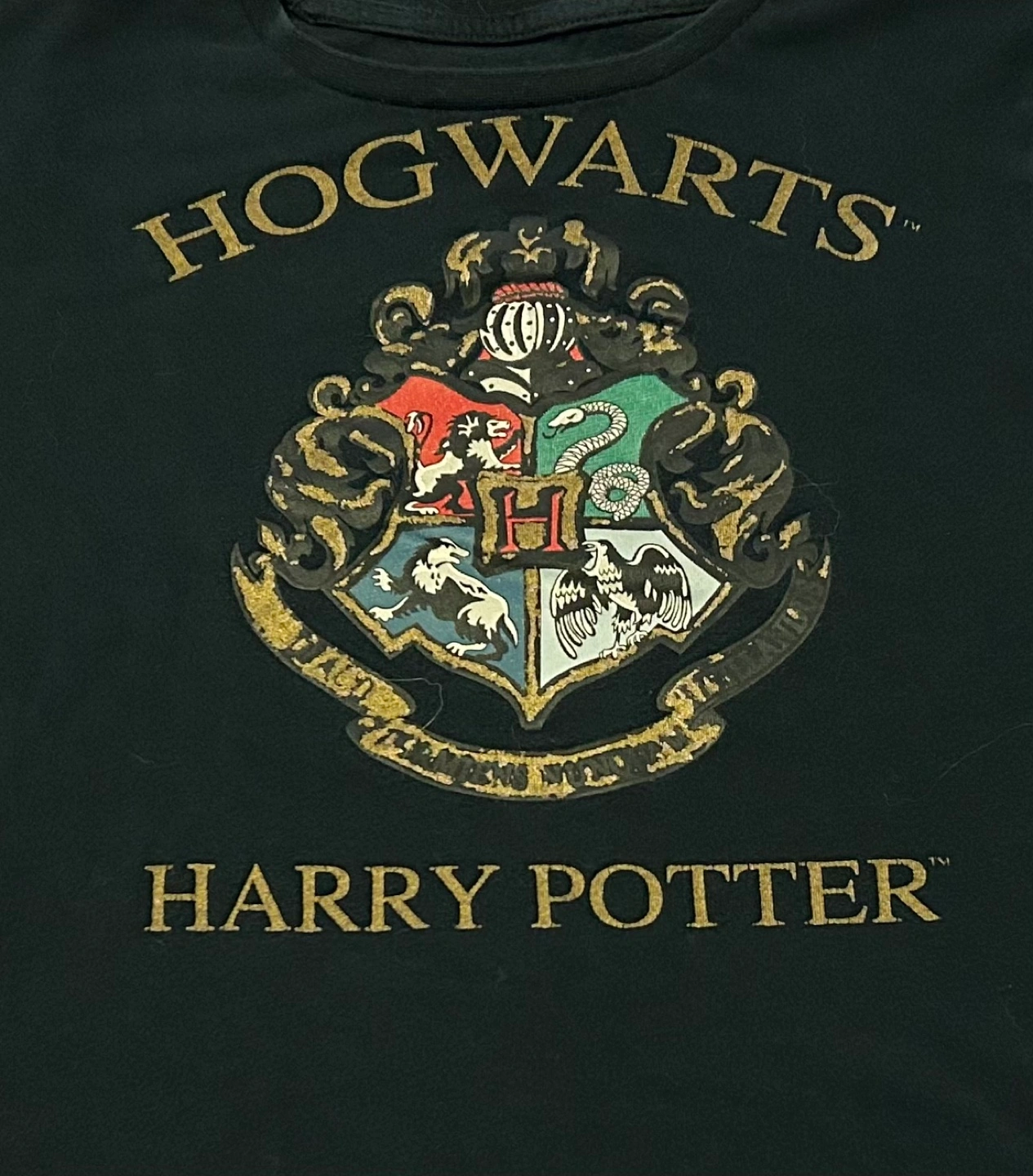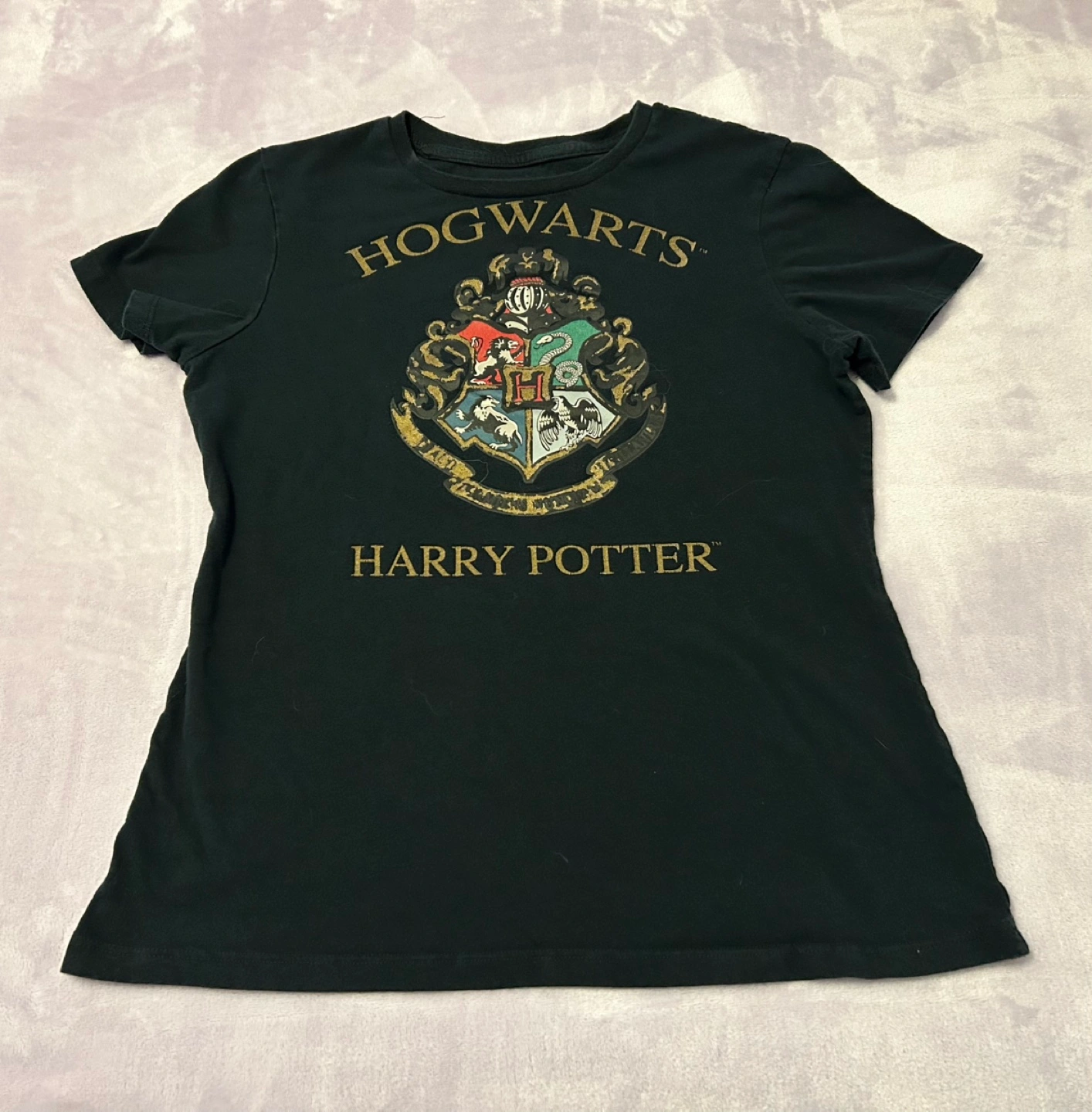 Black women's t-shirt. Features Hogwarts crest and Harry Potter text. Short sleeves. Great for fans! 100% cotton. Machine wash cold tumble dry low. Lightweight and comfortable. 😊