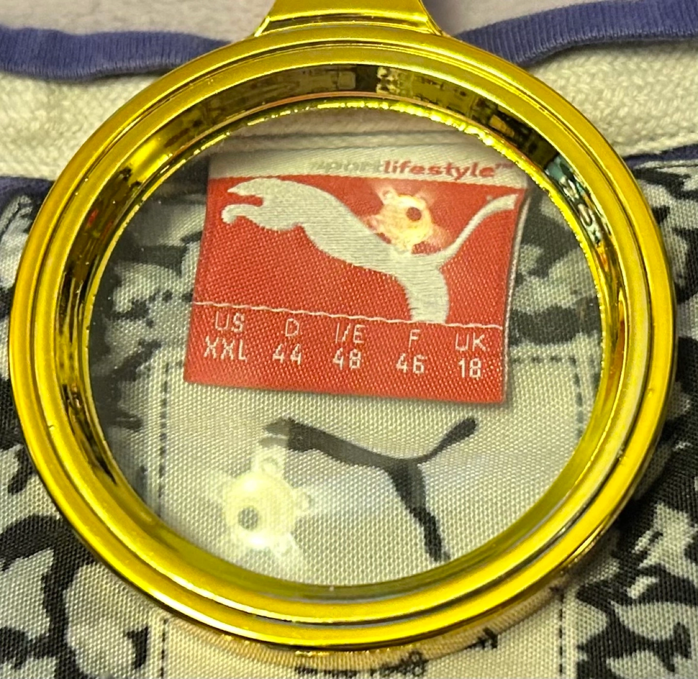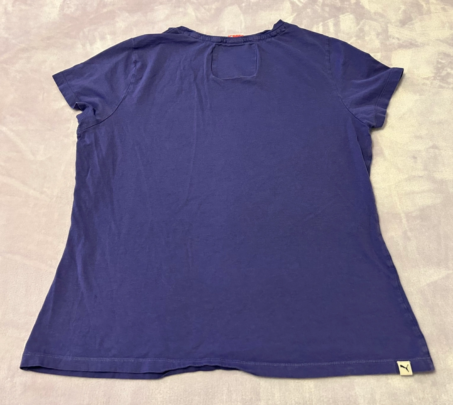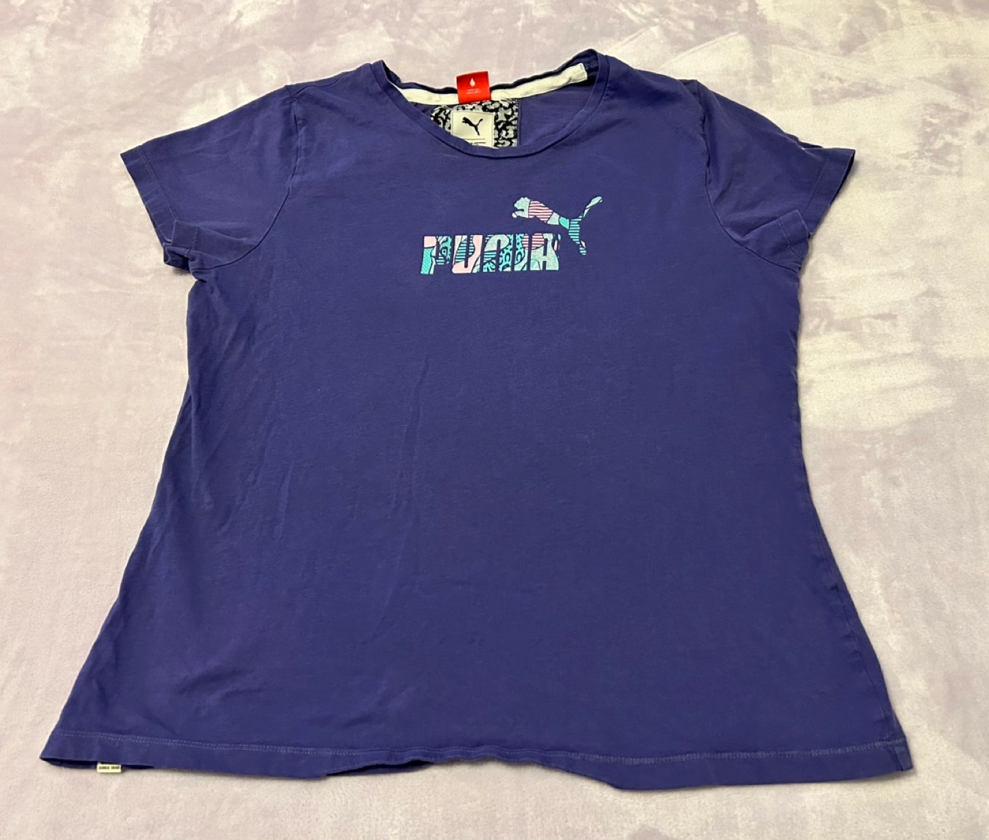Women's purple Puma t-shirt. Tags say XXL but it fits like an XS. Features a patterned Puma logo. Short sleeves, round neckline. 100% cotton. Machine wash, cold and tumble dry low. Lightweight and comfortable. 😊