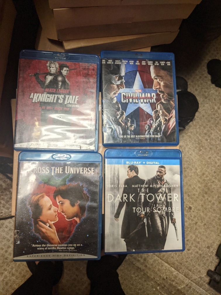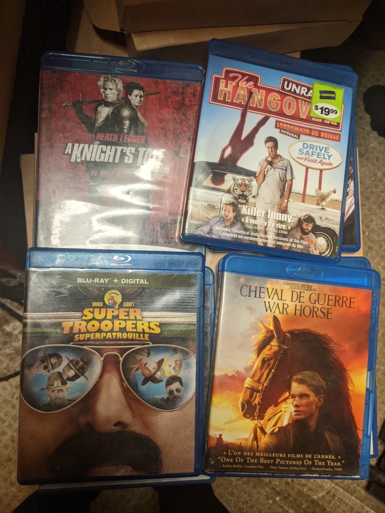 Collection of eight Blu-ray movies. Titles include: A Knight's Tale, Captain America: Civil War, Across the Universe, The Dark Tower, The Hangover, Super Troopers, War Horse. Pre-owned, may show minor wear.
