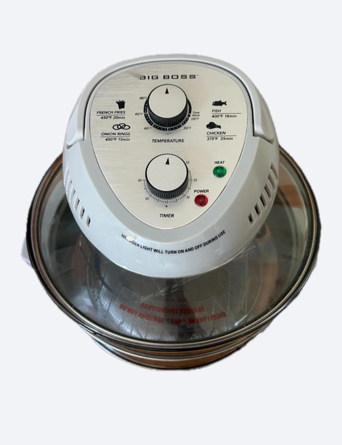 Used air fryer. Features temperature and timer controls. Includes glass lid and 2 cooking racks. Great for cooking a variety of foods.