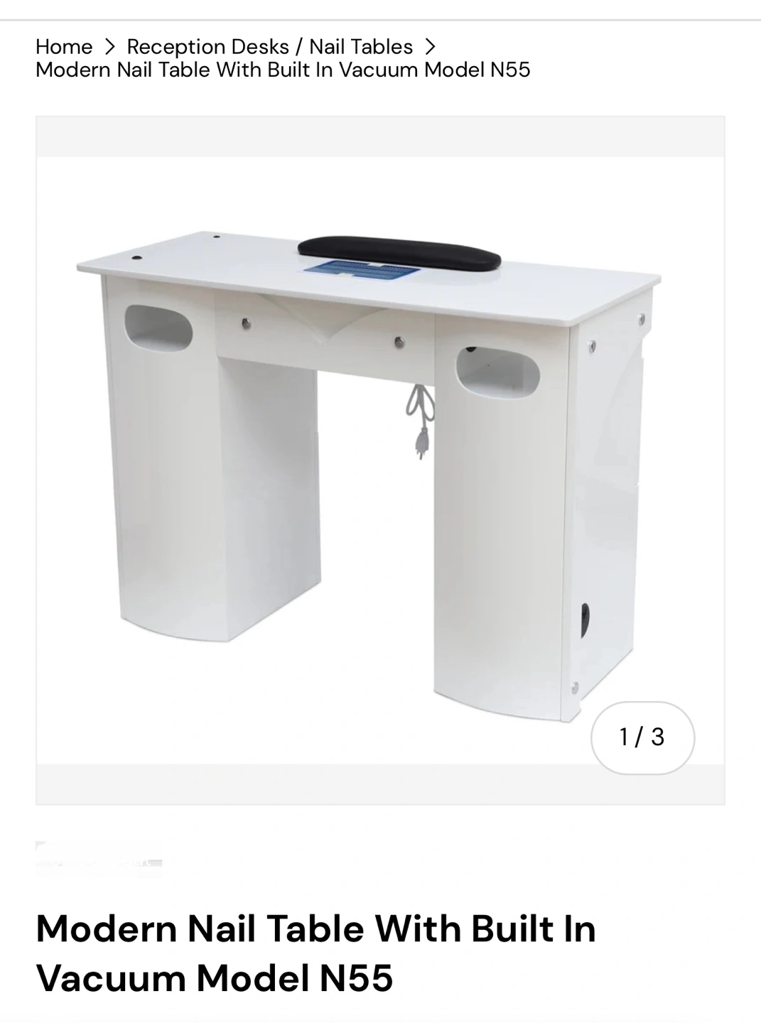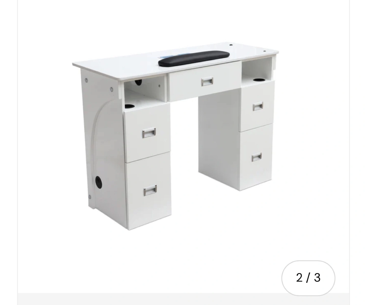 White nail table, built-in vacuum. Multiple drawers and storage. Excellent condition. Great for salon or home use.