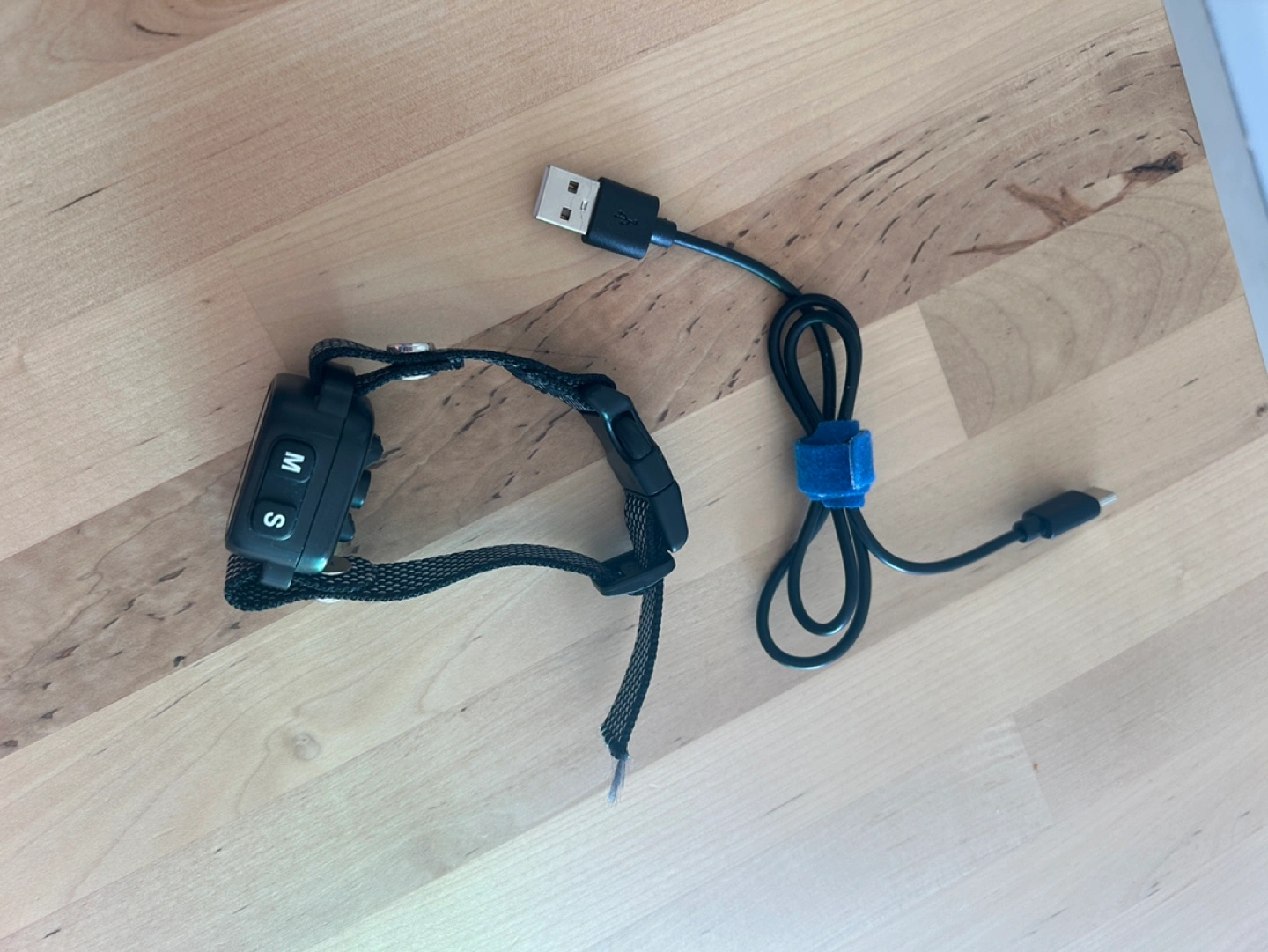 Black pet training collar. NOT a shock collar, it vibrates. You have the option to use sound, vibration or both. This size fit my yorkie. Includes USB charging cable.