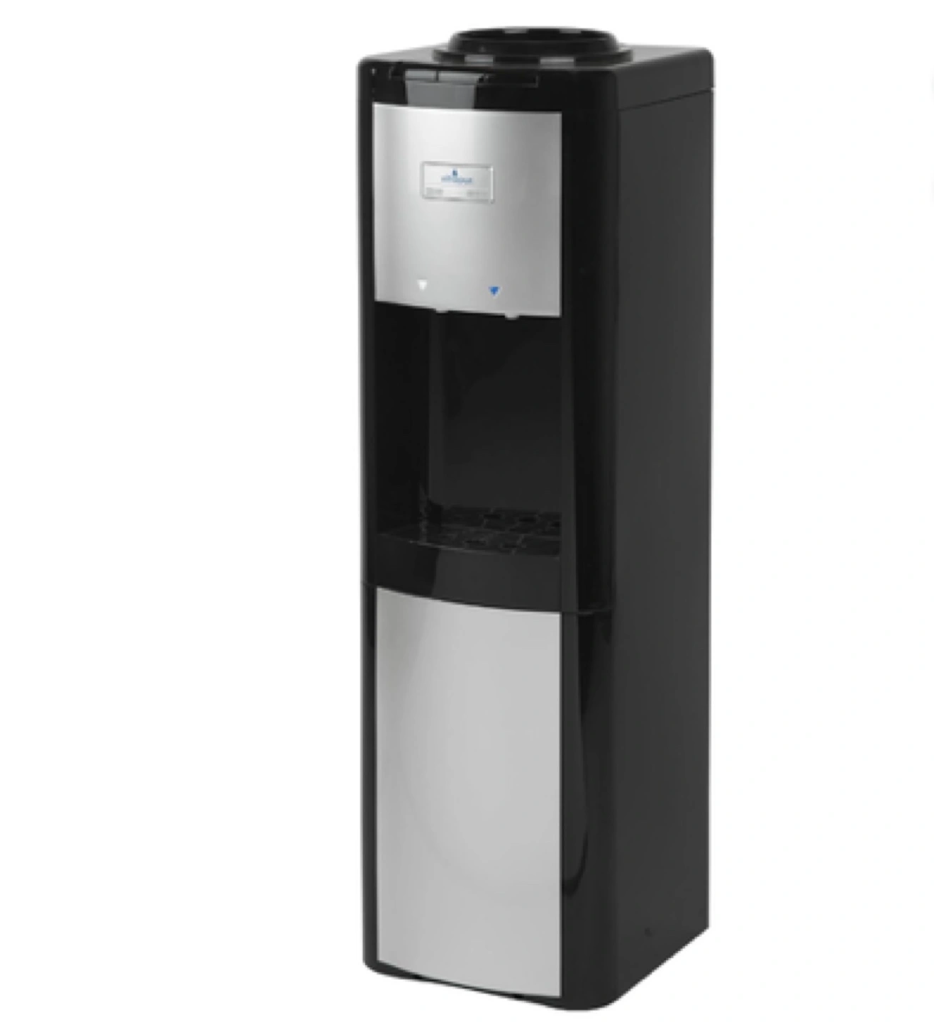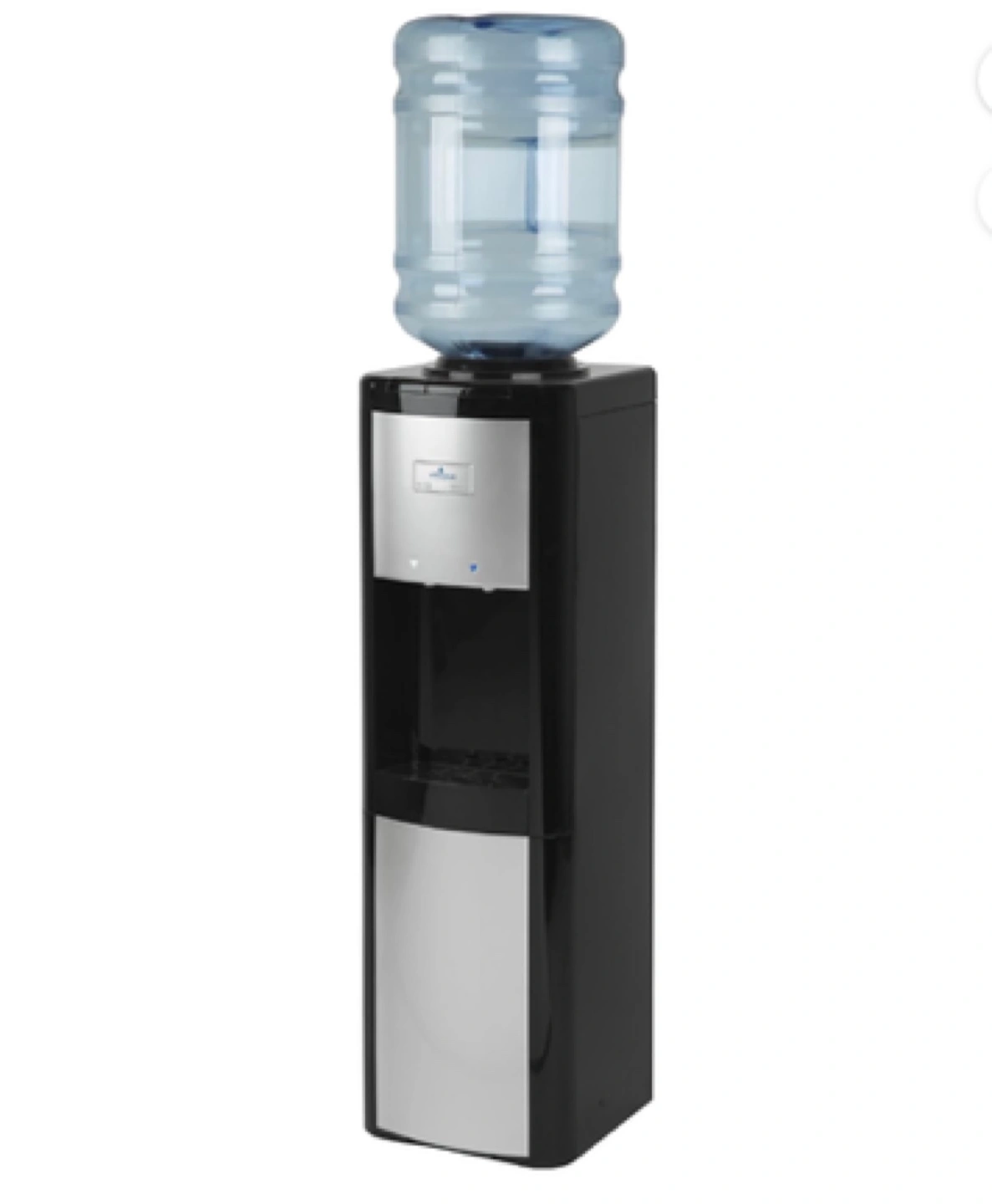 50Bottom-loading water cooler. Black and stainless steel finish. Features hot and cold water dispensers. Cup tray included. Compact design. Perfect for home or office.