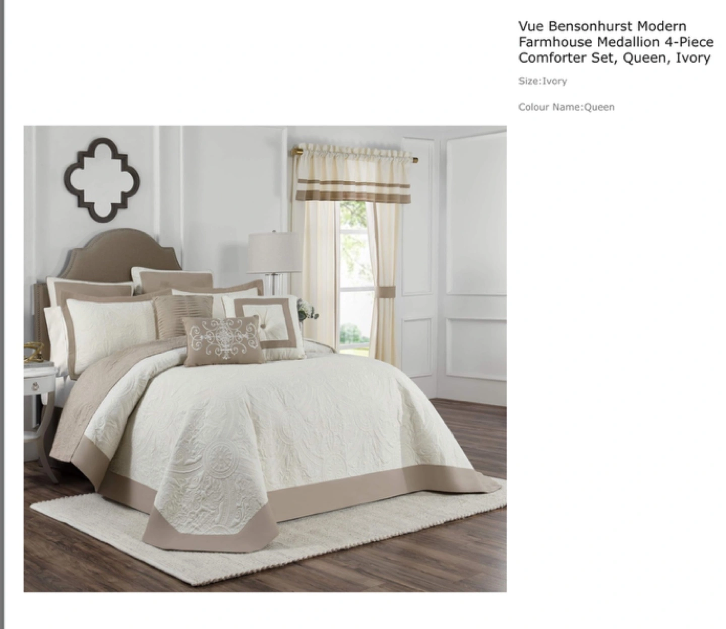 Queen size comforter set. Ivory colour. Includes comforter, shams, and pillowcases. Modern farmhouse style. Medallion pattern.