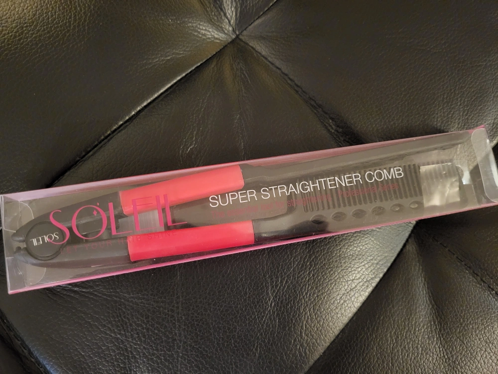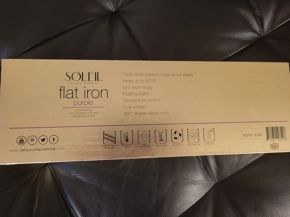 New SOLEIL purple flat iron. Solid ceramic, magnetized plates. Includes super straightener comb. Heats up to 450°F. Dual voltage. 360° swivel cord.
