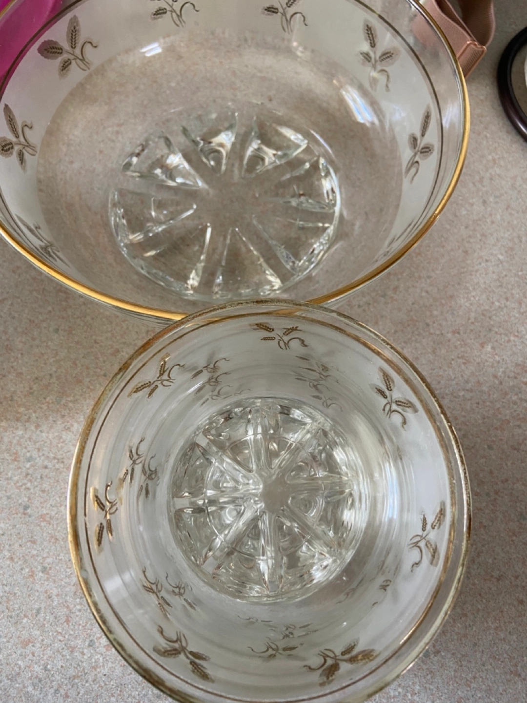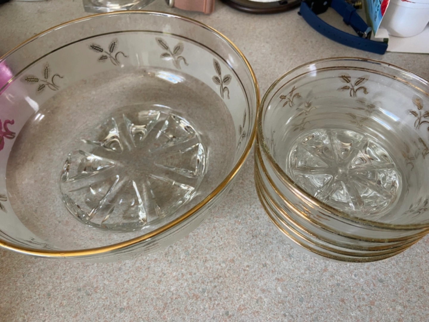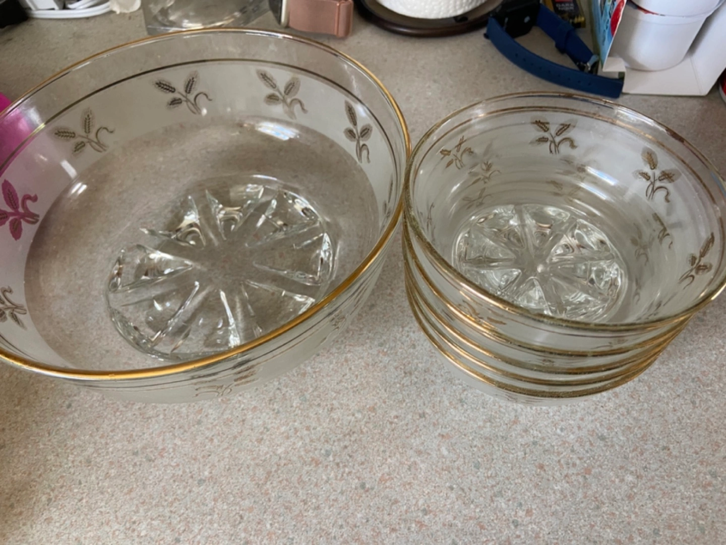 Beautiful vintage glass bowl set. Includes 1 large bowl and 5 smaller bowls. Features a frosted glass design with gold trim. Elegant and perfect for entertaining.
