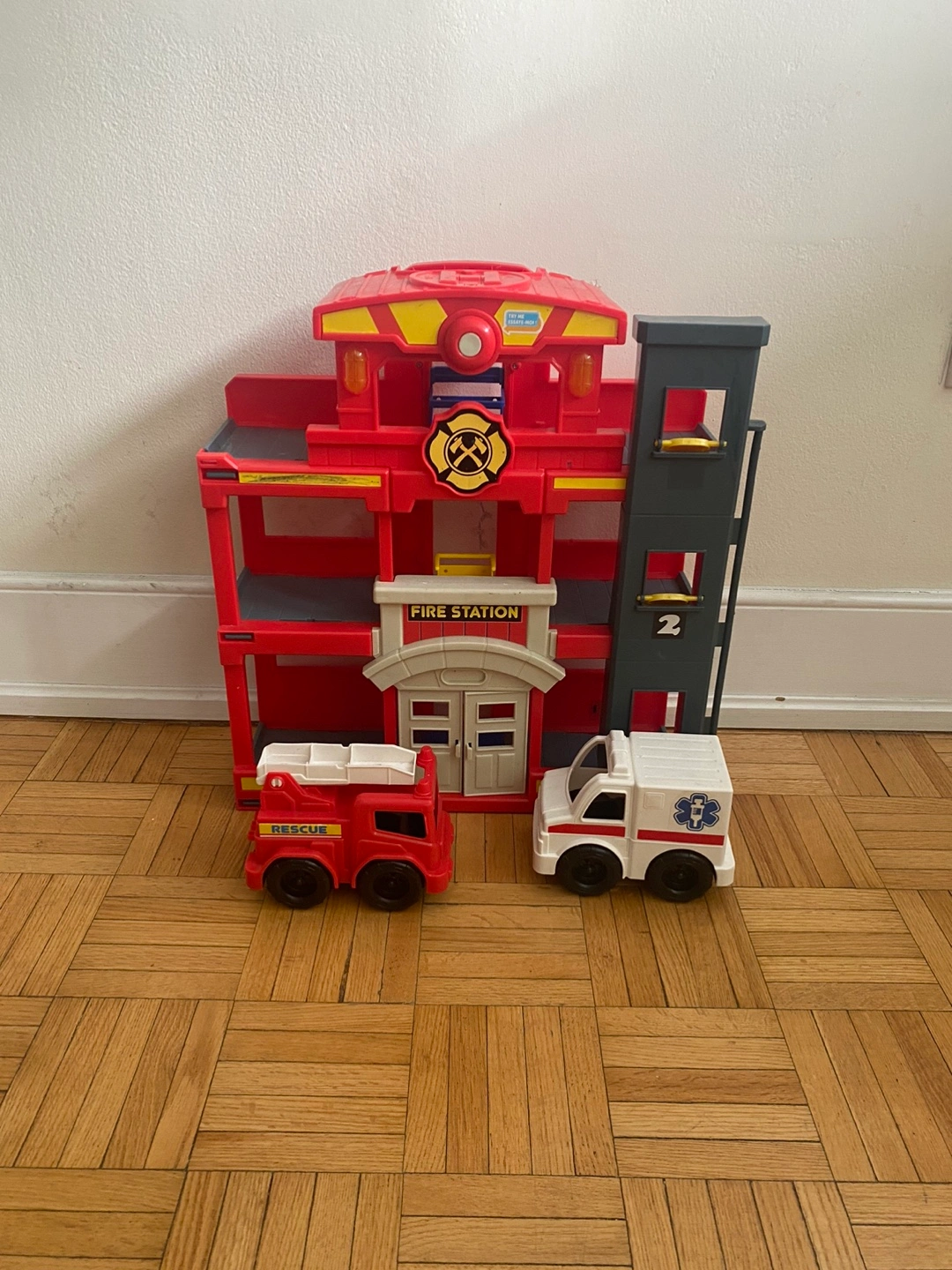 Multi-level fire station playset. Includes firetruck and ambulance. Great for imaginative play.