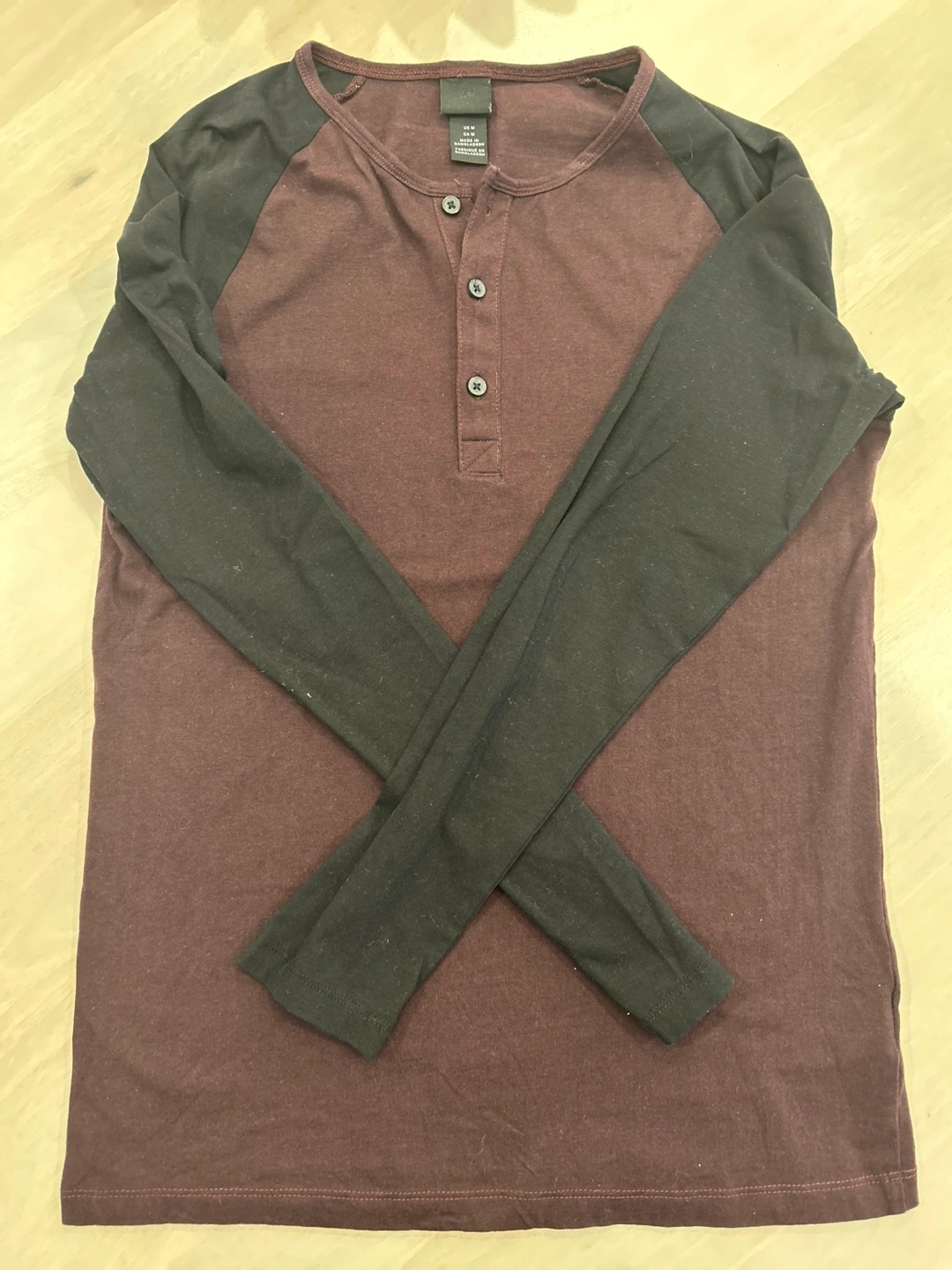 Maroon and black long sleeve henley. Size medium. Colour block design. Button placket.